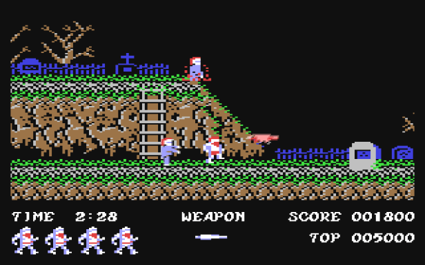 The Spectrum version looked just like the arcade, minus the colour. That’s not to say it wasn’t colourful – tons of colour clash all over the place and because Arthur took on the colour of the background, you often found yourself lost in it! Unfortunately the sound didn’t translate so well, but met the usual low expectations. It played great though, and I can still feel the stiffness of the Atari joystick as it got wrenched from left to right and back again to chuck swords at enemies coming from all sides. An absolute classic, until your best friend got it on C64… Now that graveyard really is iconic!