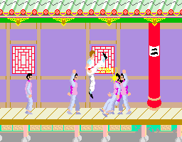 It’s not a visual feast, but it drips martial arts movie atmosphere, being very inspired by the Bruce Lee movie Game of Death. You’ve got a punch and kick button, then left, right, crouch and jump on the joystick; you could also waggle it to free yourself from an enemy grip. You got more points for punching than kicking, but a jump kick was worth more. And the number of points depended on the type of enemy, whether regular thugs, tougher ones, knife throwers or oddball “bonus” enemies like moths and vases! Then you had the bosses for more points – I can only really talk about the one with sticks on the first floor and not getting beyond the one with boomerangs on the next, but they get more exotic with a giant, a black magician and Mr X. I think generally if you could back the first ones up to the stairs you just had to punch and kick a lot to beat them.