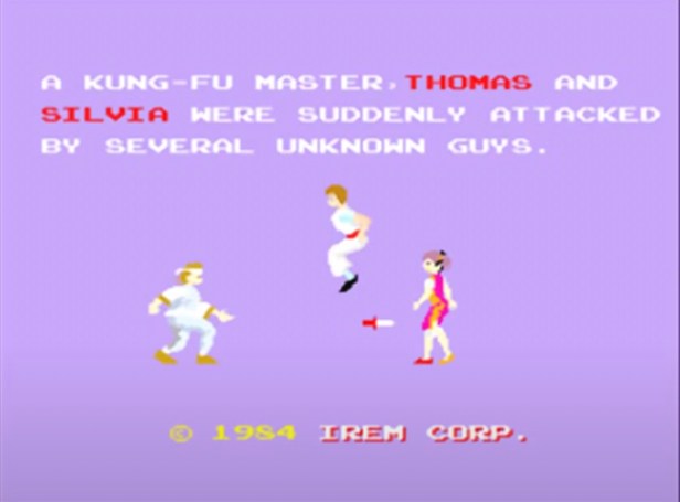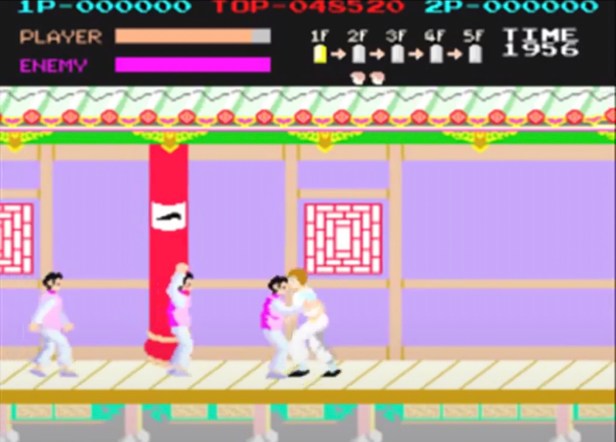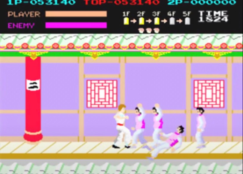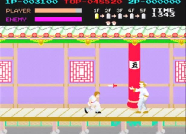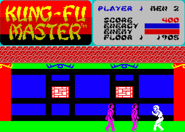 I reckon Kung-Fu Master appeared there around 1985. An iconic (and possibly the first) horizontally scrolling beat ’em up where you’re making your way against the clock and waves of goons to a boss by the stairs to the next of five floors. I remember watching older kids playing it and getting a few floors up, but this is one of those games I absolutely loved without being very good at it and never getting beyond the second floor.
