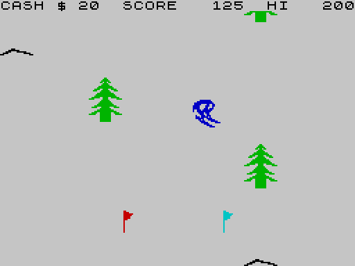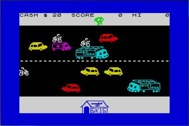 After a particularly garish loading screen, perfectly complementing the garish sounds coming out of the speaker, you’ve got to get Horace across the road to the ski shop. This is a particularly brutal, but great looking take on Frogger. You start at the top of the screen with some money in your purse for ski hire. The shop is at the bottom, and in between are some fantastically detailed lorries, cars and motorbikes, moving unpredictably in both directions at a serious pace. Get hit and an ambulance takes you back to the start, for a price. If you’re left without cash for ski hire, you charge around the road to be rewarded for your recklessness! Get across with enough money and it’s time to hit the slopes.