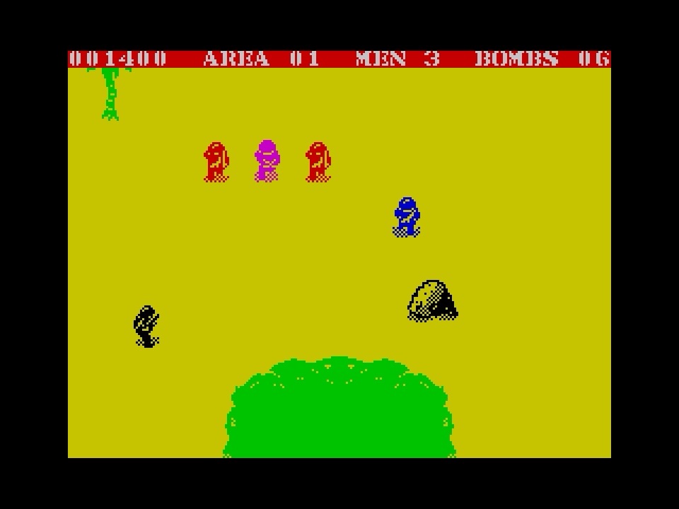 When I picked up the Spectrum version at some point in 1987, it took a few more seconds than that to get over a different problem, which was the graphics. Or more specifically, the colours. The loading screen is kind of what would have you’d have expected of the Spectrum, with all colour removed, but the developers had other blue and red and yellow ideas for the game itself, which resulted in some lovely colour clash if one of the enemy soldiers ended up behind a tree!