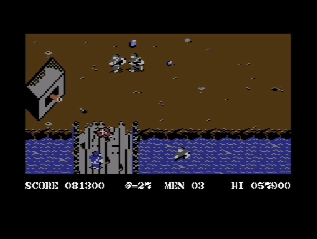 Aside from the colours though, this was another great conversion. The graphics are beautifully detailed and everything seemed to have been translated over from the arcade machine in all the right places – something else that the new iOS version revealed! It’s missing the great C64 tune, of course, but the sound effects are fine. The gameplay remains outstanding though, with a relatively easy first area that culminates in a frantic onslaught out of the first mini-fortress, but then the action really heats up with bunkers, bazookas, gun emplacements and barracks full of enemy soldiers appearing from all directions. It controls so well though that it rarely feels unfair when you die, generally in the second area if you’re as skilled at playing as I am, which kind of negated the high score table for me – it was only ever about getting to the third area!
