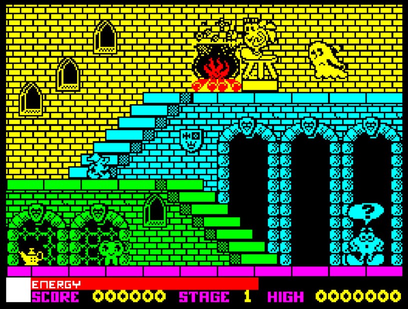 The very first (of the aforementioned eight) screen is everything I love about this game. The creepy atmosphere is just incredible, and bizarrely everything being yellow somehow adds to the atmos! The attention to detail in the little 3D castle windows or the ornate stone flourishes above the portcullises really bring the castle alive. And it doesn’t stop with the backgrounds – don’t move for a second and Olli’s blobby sprite will turn and question what you’re playing at, then start tapping his foot impatiently. Meanwhile, up at the top of the screen, Sir Humphrey’s ghost paces (in a floating kind of way) up and down the platform where Lissa is waiting to mix stuff up.