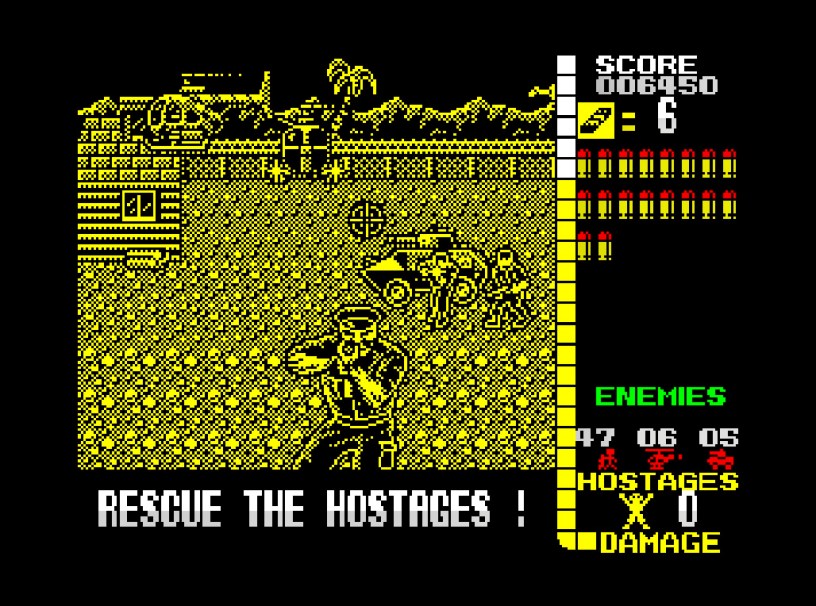 The story, such as it was, was true to the arcade original – go through six military themed levels in jungles, prison camps, airports and various bases to rescue the hostages. Each one was a bit more than just shooting everything in sight; you’d have a task like cutting off the enemy communications or getting information out of the enemies, although all of that did involve shooting everything that moved unless it was one of the fleeing civilians or nurses carrying some unfortunate in a stretcher who shouted “NO!” if you shot them. The first few levels were all do-able but I’m not sure I ever got to the end of the final level in the airport.