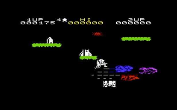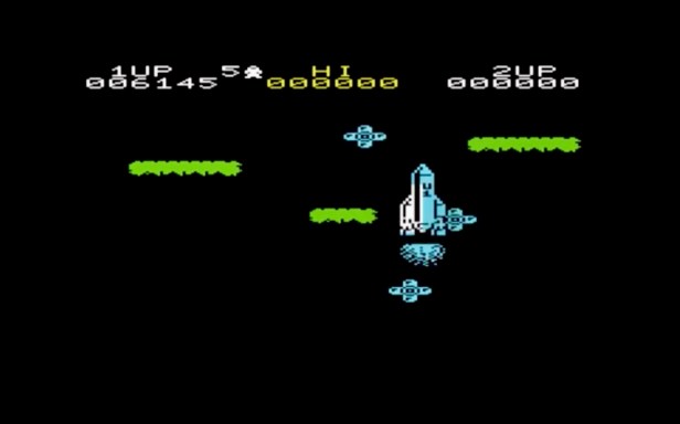 You play as Jetman, though a bit like Mario’s first appearance in Donkey Kong, I don’t remember ever knowing him as Jetman – he was just an astronaut with a jet-pack and a blaster who had crashed on a planet far, far away and had to rebuild his rocket from the bits strewn about the place then fuel it up and start making his way home. All of this happens on a single wraparound screen, with three rocket parts that had to be dropped on top of each other in order, which you’d find lying on the ground or on mid-air ledges, whilst fending off the planet’s fauna that randomly flies around the place impeding your quest. Once you’ve put the rocket back together, fuel starts dropping out of the sky, also randomly landing around the screen, together with bonus jewels and stuff, which you collect and drop onto your rocket until it’s full up. Then you walk back into the rocket, it takes off and you start collecting fuel on the next planet, which is a similar screen but with a whole new set of meanies to attend to.