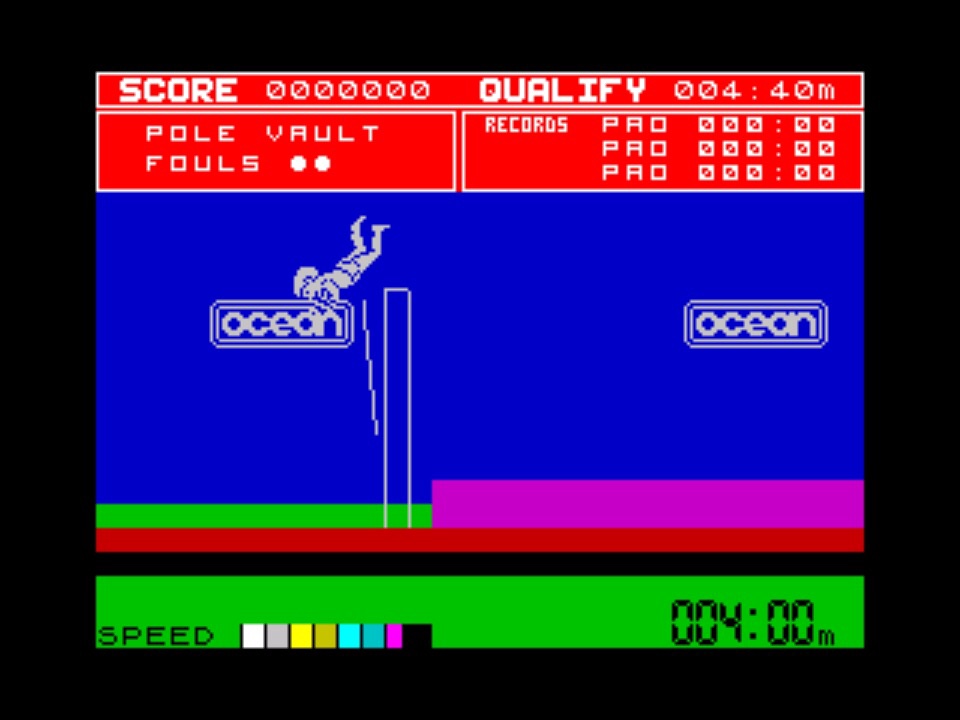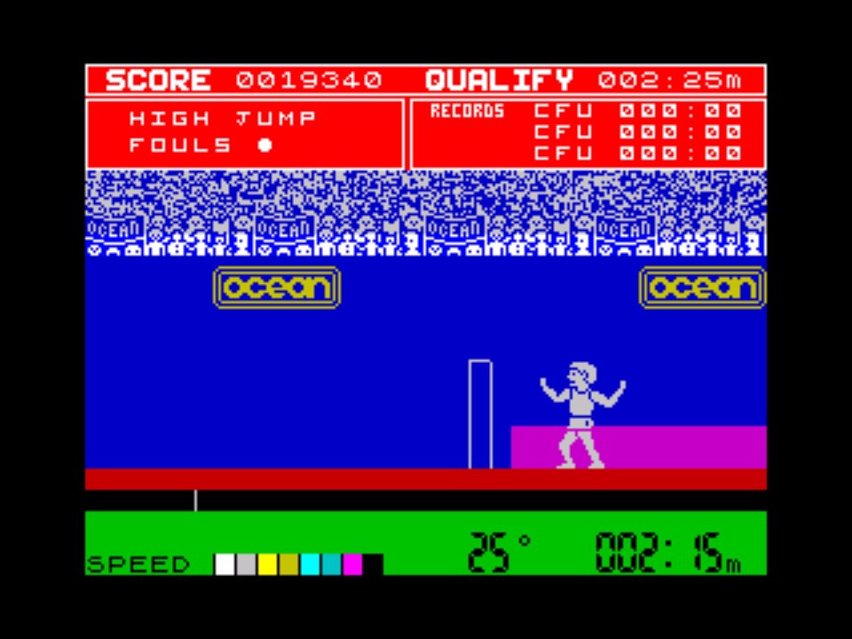 Apart from Daley Thompson’s questionable ethnicity in the game, there was an awful lot to look at and be impressed by. As said earlier, the white character did avoid any serious colour clash so everything else was very colourful. That screen was really clearly presented (and pretty much directly lifted from the Track & Field user interface) – your score and qualifying requirements at the top, current attempts and records below, then the best crowd representation I’d seen up to that point, moving around excitedly with their Ocean banners; below them you’ve got the track or field area with your main man in action, and at the very bottom a speed, angle and distance guage that appeared as required. Every event was smoothly animated even if the running has aged a bit today, with nice touches like the guy with his tape measure in the long jump or the shadow under the shot putt as it flies through the air.