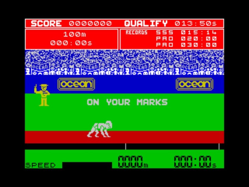 Sound effects are mostly non-existent up to this point, apart from some white noise of varying lengths representing a starting gun or crowds cheering when you qualify, but there are some short bursts of music elsewhere between events, and, most notably, when you win gold at the end of all this, with a beautiful (in Spectrum terms) rendition of Chariots of Fire as white Daley stands on top of the podium with his arms held high. Then you get the final score and you’re ready to go all over again. After loading side one again, of course.