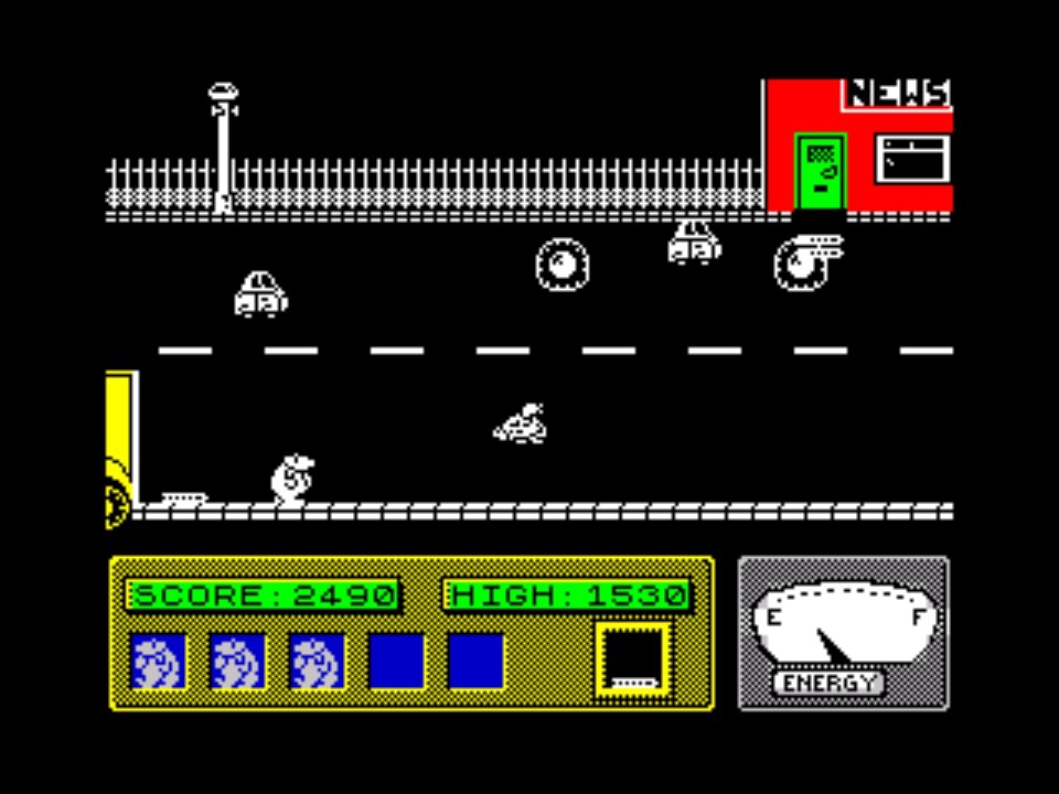 Despite the usual gaming perfection that a Monty Mole game demanded of you, this one seemed to be about getting lucky sometimes too. And I think that’s why even after the head-scratching is done, I like going back to it, then trying to get through it again and again a bit quicker. Combining that slight unpredictability (possibly caused by some odd timing that I can’t really put my finger on) with its shortness actually makes it more akin to playing something like Super Sprint than the traditional platformer it makes out to be. You definitely can go a bit faster, because you definitely can do it without running into something, but will you? And all this going faster is actively encouraged throughout the game because your energy meter is going down regardless of what you run into, and in the penultimate screen you’re also racing magazines getting finished (where I still don’t really know what means death and what means success)!