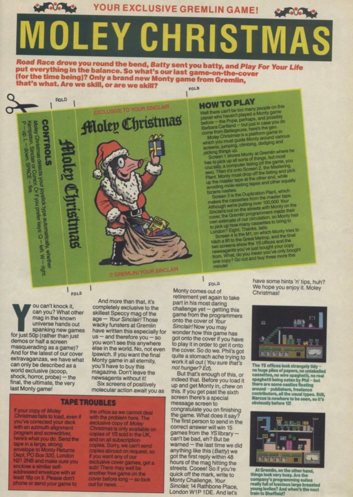 There was actually another game between the fourth and fifth entries though, but blink and you missed it! Moley Christmas was only available on the cover of Your Sinclair magazine, in the Christmas 1987 issue, in what for me ranks as one of the highlights of what would become the Spectrum cover tape wars! I know I was long gone by the time they were all abandoning actual magazine content and just sticking about ten AAA games to a few bits of glossy paper, but before that, this and Ocean’s Road Race (which we’ll come back to one day) and, of course, the seminal better-than-Arkanoid Arkanoid rip-off, Batty, were way better than most of what you’d pay full price for!