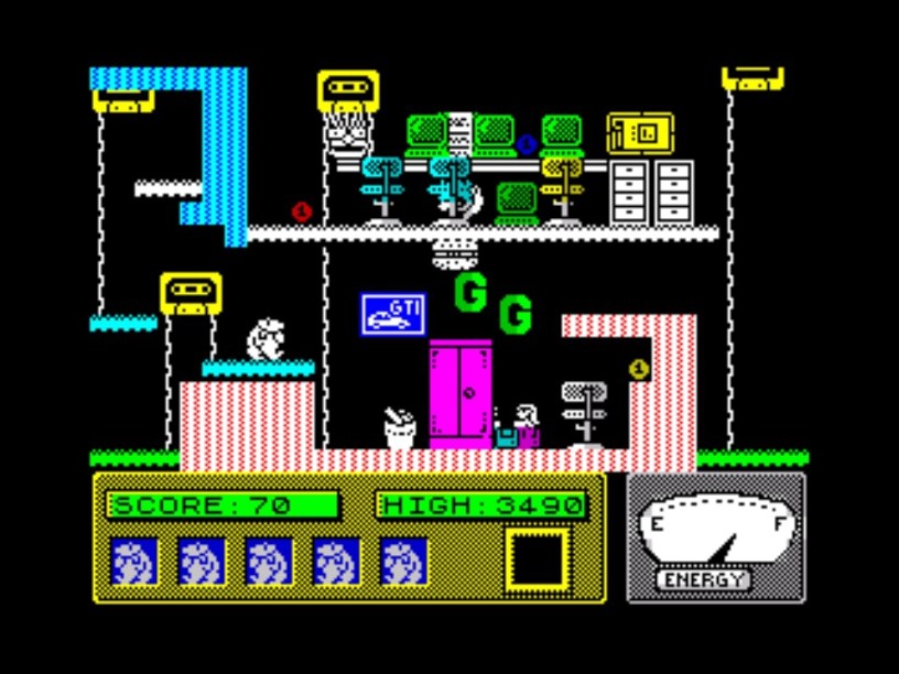 Despite the usual gaming perfection that a Monty Mole game demanded of you, this one seemed to be about getting lucky sometimes too. And I think that’s why even after the head-scratching is done, I like going back to it, then trying to get through it again and again a bit quicker. Combining that slight unpredictability (possibly caused by some odd timing that I can’t really put my finger on) with its shortness actually makes it more akin to playing something like Super Sprint than the traditional platformer it makes out to be. You definitely can go a bit faster, because you definitely can do it without running into something, but will you? And all this going faster is actively encouraged throughout the game because your energy meter is going down regardless of what you run into, and in the penultimate screen you’re also racing magazines getting finished (where I still don’t really know what means death and what means success)!