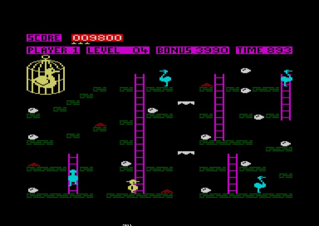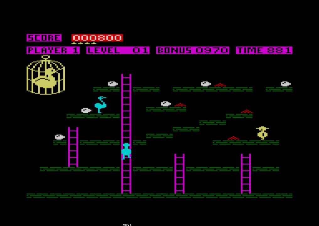 Chuckie Egg has the classic arcade-platformer premise, with your little guy, Hen-House Harry, setting out on each screen with a load of eggs to collect against the clock, a load of corn he can also collect to slow the clock and get a few extra points before it gets eaten, and some ducklings that look more like ostriches chasing you around platforms, ladders and lifts. This all goes under the gaze of mother duck, trapped in a golden cage at the top of eight increasingly fiendish screens, but if you conquer those then she’s out, and unlike her little fixed-path duck-ostriches who’ve now disappeared, she can chase you anywhere on the screen. Go round all the screens again and she’s back, the duck-ostriches are back, and you’ve got no chance!