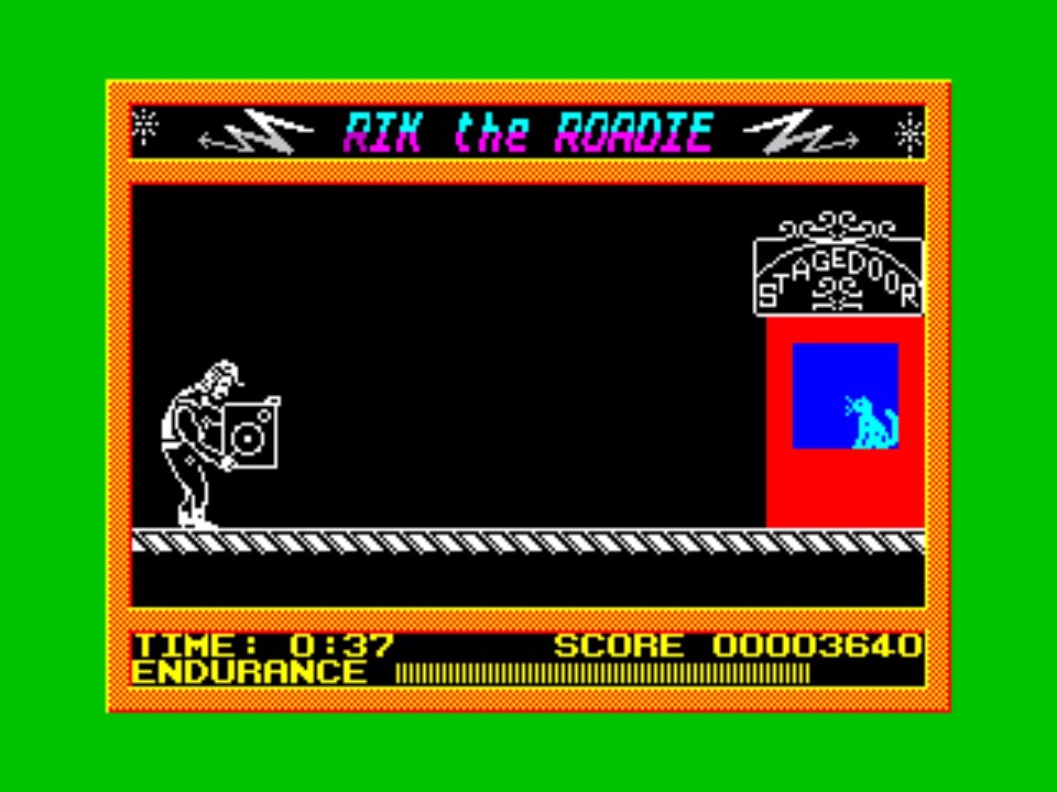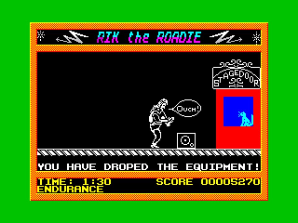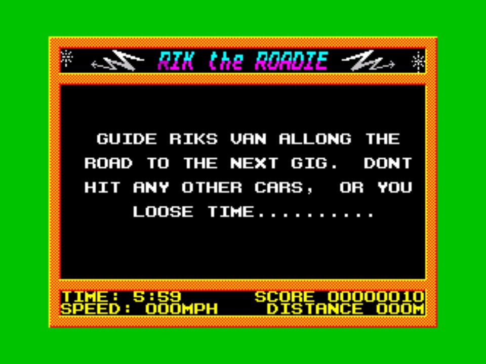 I didn’t get very far before I got to a game called Rik the Roadie for the Amstrad CPC, all the way from 1988. And I’m not going to say what he thought about it because you can read it for yourself, or use your imagination, but at the end of his rant he mentions that there was a Spectrum port… And, despite everything he said, I still wasn’t convinced it sounded that bad…