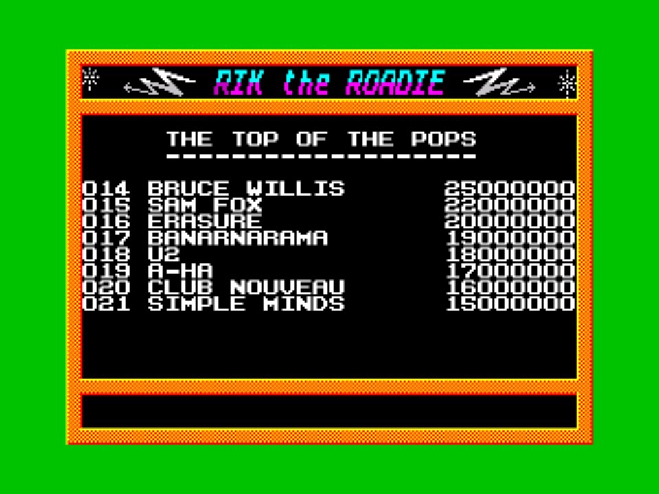 But all of this pales into insignificance once you get to the high score table, which is effectively a chart rundown of the big hit makers of the day, like U2, Simple Minds, Bruce Willis (Bruno, surely?), Erasure and Sam Fox. And Banarnarama, Des O’Conner, Madona, Kim Wild, Jean Michel Jarr… And it doesn’t end there, but typing things that incorrectly is a real struggle in this day and age, and you also need something to discover when you play it for yourself!