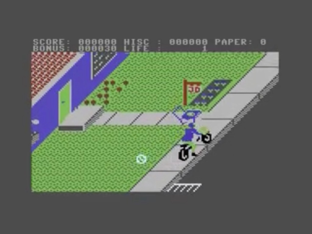 All the way down the street you’re avoiding hazards like bins and rampant tyres and lawnmowers, cars, go-karts, pets, skateboarders, breakdancers and all kinds of crazies that will spell instant death, losing you a life but thankfully allowing you to carry on your journey until you run out of them. Get to the end of the street and you’re rewarded with a go on the training course, with ramps to jump over, moving obstacles and targets to throw your remaining papers at for more points. Including this was a genius move, because whilst they already had a unique game in an isometric racer that involved delivering newspapers, they also hit on the massive BMX craze in the mid-eighties with the training course that pretty much sold the game by itself! Anyway, get to the end (or not) and you’ll get your daily totals and any cancelled subscriptions, and you’re onto more of the same but harder and with different things to kill you on the next day.