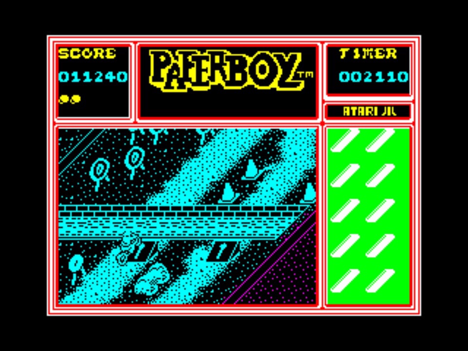 The game had you, the paperboy, delivering newspapers to your subscribers down Easy Street, Middle Road or Hard Way (also the three difficulty levels), every day from Monday to Sunday. You start with a minimap of the street showing where your friendly neighbourhood subscribers are, and also where the villainous non-subscribers are, though you will pretty much ignore this as one lot live in bright houses and the others dark houses. You need to deliver the newspapers by throwing them at the mailbox outside the house, ideally, which gets you the most points, and if you get them all you’ll double your score. This will also win back any non-subscribers you’ve lost previously because you missed their house. You also get points by vandalising non-subscriber houses, and smashing one of your newspapers through a window is still one of my favourite things in all of gaming! (Closely followed by breaking what I think are gravestones you can bust in half)! But don’t go too nuts because you’ve got a limited supply of newspapers so keeping your subscribers happy needs to be your priority, though you will come across refills on the way.