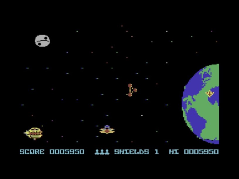Apart from the word “Deathstar” we are not really getting the very in your face Star Wars vibes of the Spectrum advert, so we are possibly pre-licensing of the Star Wars theme tune. And when we previously mocked the C64’s hamburger and coat hanger enemies, they might simply have been what was there in this original(?) version before any Star Wars association – as loose as it was – materialised on the Spectrum.