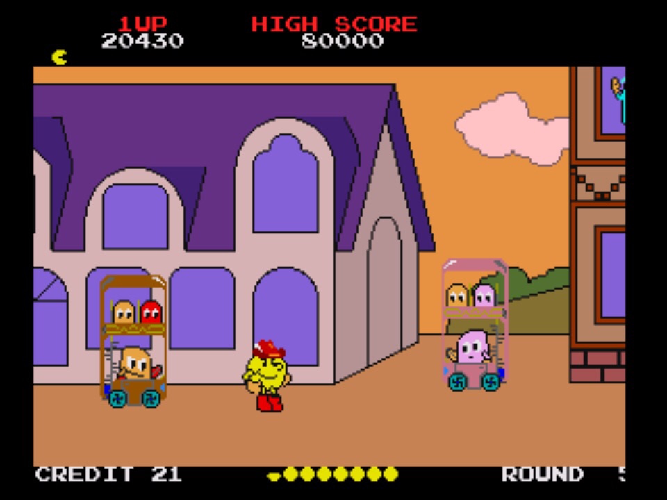 The hugely vibrant look of the show was ported wholesale to the arcade game, as was the iconic music that looped throughout, which you could sniff out in an arcade like a pig sniffing out truffles; in an audio kind of way! The detailed character designs, complete with hats and hair – not to mention their super-smooth animation style – were also a big feature of the game. Pac-Man alone had 24 different frame patterns, where one or two was the norm at the time. As a[nother] side note, something that didn’t come from the cartoon, but by coincidence is relevant here, are the controls – they came from Track & Field, using buttons instead of a joystick, which allowed for those lovely springboard long jumping bits that will always be my favourite part of the game!