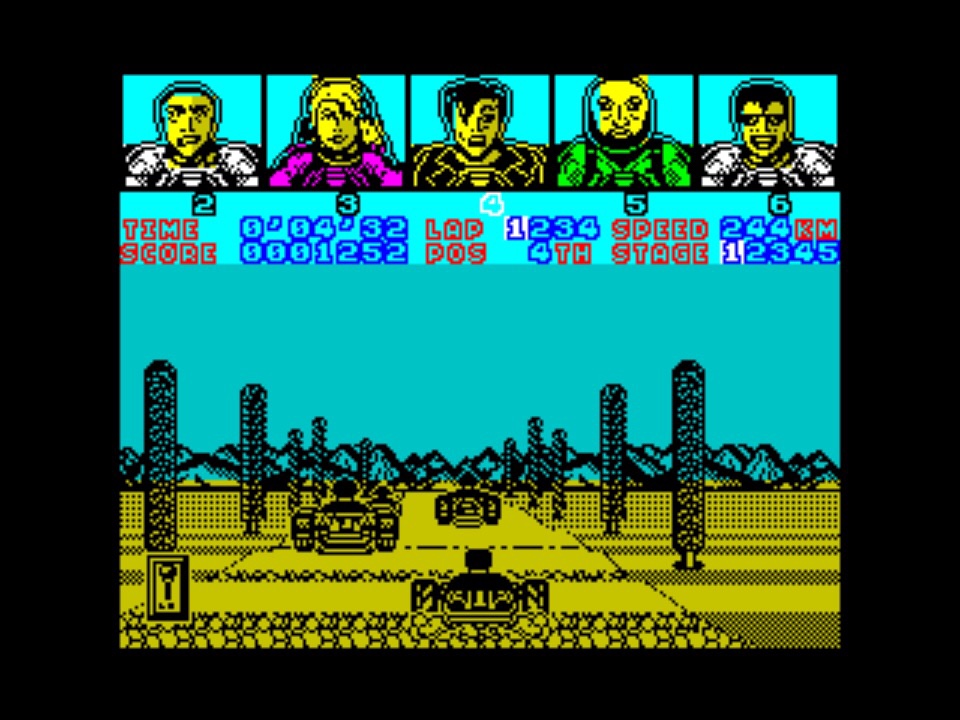 This just feels like a much more ambitious conversion that the Commodore 64 one. The graphics have loads more going on, with all sorts of bumps in the road that you really feel, as well as the arcade-like hills going off in all directions. The 128K version (which is the one you want to avoid multi-load) kind of fixes the lack of sound effects too… Until someone in front of you finishes before you, in which case everything seems to go silent in sympathy! And sometimes it seems to just decide you’re getting music instead of the preferred engine sounds on some tracks too.