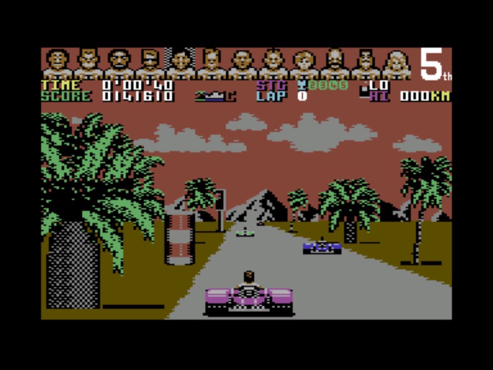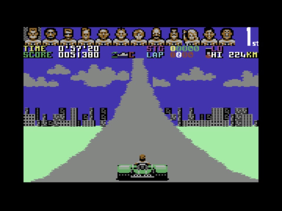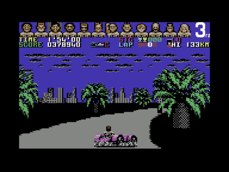 My first impression of the C64 version wasn’t that great. And keep in mind that at this point, this is my only experience of an 8-bit version of the game, not Spectrum bias! The road edges looked rough, and when you hit the hills you’ve got a jarring journey up the screen on a straight, flat floating road with no ground on either side, versus the exhilerating gravity rushes of the arcade version. I’m not a fan of the sound either – if I have to make a choice, I want engine sounds in a racing game and not a chiptune. But for all of that, it’s so much fun to play! I had no expectations that this was going to run at any kind of pace at all, but apart from the lacklustre hills, everything flies by in beautifully varied 3D across the different courses. Cornering feels really tight but loose enough at the same time to make you feel like you’re hanging on for dear life in the later tracks. This is a really, really good conversion!