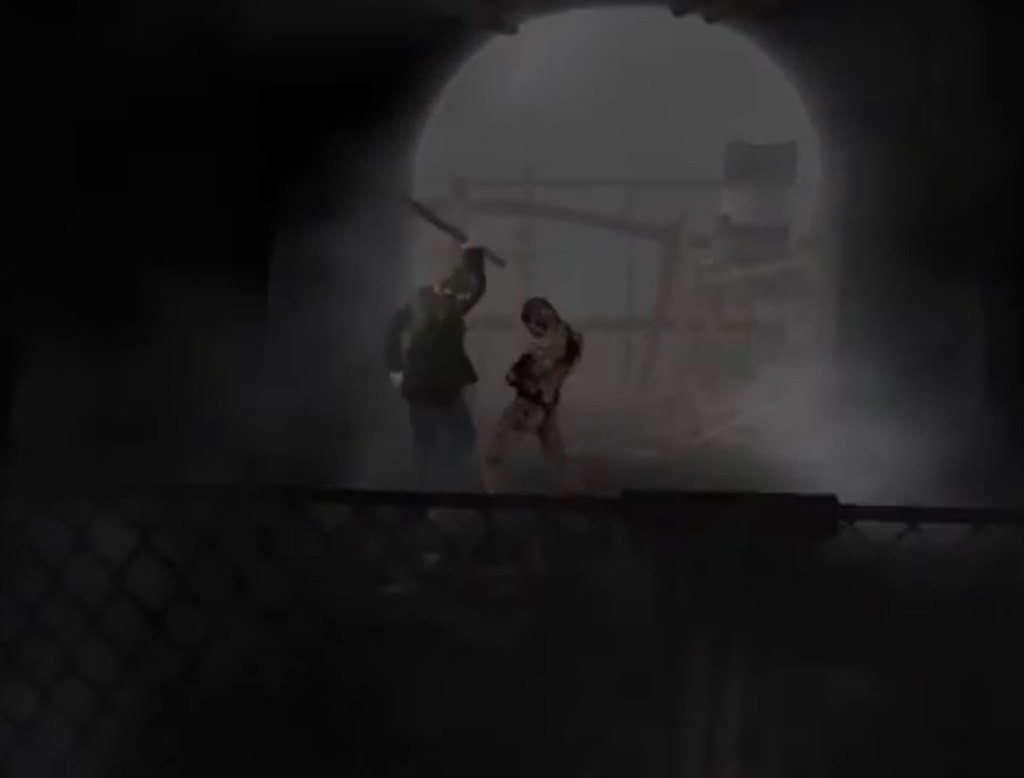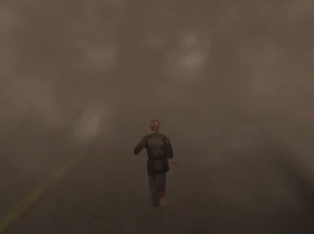 And then you’re continuing your descent through the fog as everything you remember about Silent Hill gradually emerges in front of you. But this time – just like the fog – it’s “proper” Silent Hill like you’ve never seen it before, and it’s beautiful! The textures on the pavement and the wooden telephone poles and the chain-link metal fences, and the attention to detail in things like signs or posters or stickers on dirty shop windows, and the kerbs and drain covers and bloodstains on the ground… And that fog is still so cool and so real this time with its own dynamic textures and shades of grey! And by now those ominous sound effects are really doing a job on you too! You’re touching everything (except, perhaps, dirty urinals) because everything looks like it’s there to be touched, and you realise all the roads aren’t half a mile wide like in the first game anymore, and you’re trying to get your bearings, and then in the midst of all this tension that’s been building up in you for the last twenty minutes, is that finally something unnatural shuffling around in the fog ahead of you? And so it really begins!