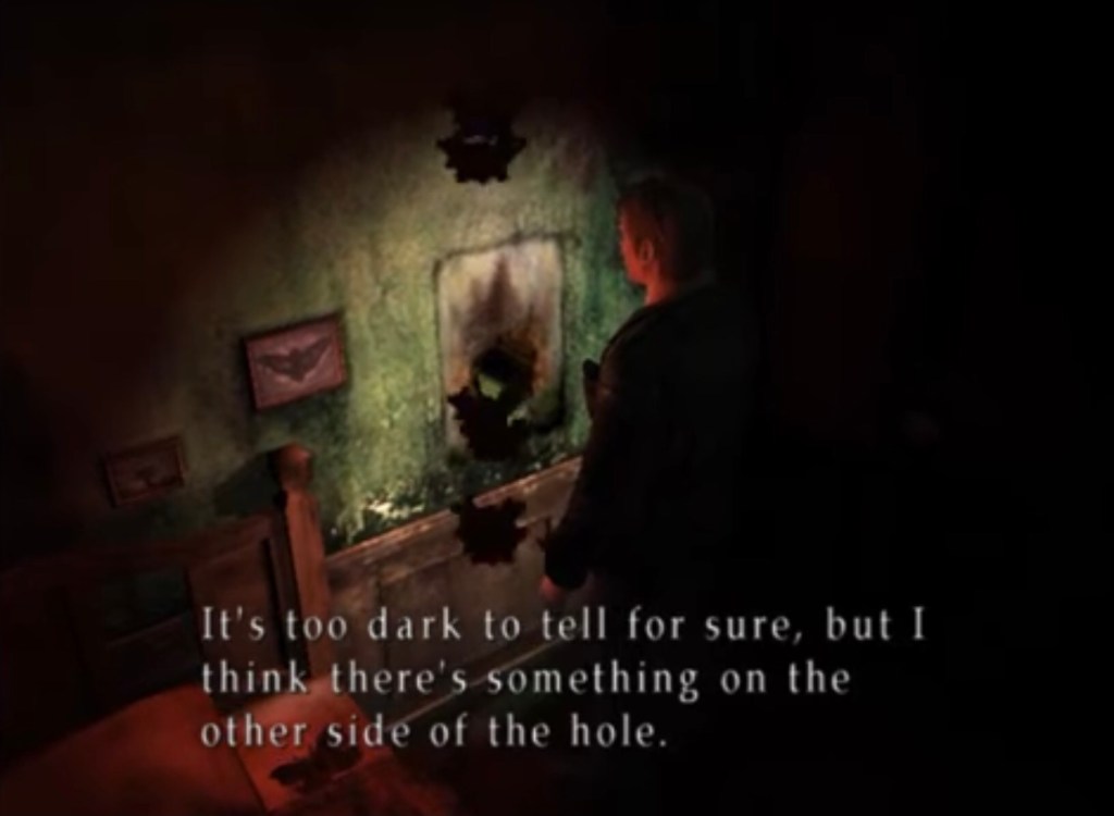 And of course there’s a hospital, and of course there’s the Otherworld, the very personal nightmare parallel or non-parallel reality or non-reality! This alternate dimension takes the previous oppressiveness of wherever it springs up and multiplies it by a hundred, where those bloodstains are not details any more, but entire walls, with floors piled with rotten meat and corpses, and rusty chains and cages and general nastiness. On subsequent visits there’ll be fire and burnt-up horrors too; and a freezing, bloody slaughterhouse; and something draped in scarred, decaying flesh in a room draped in scarred decaying flesh that’s moving and pulsating and as soon as you work it out will probably be more disturbing than anything else you’ll see in rest of the game. And these reflect that personal nature of the Otherworld depending on who you’re with when it appears, and what’s made them so messed up that they can create this version of hell. Then there’s the water. Always some water around… And the darkness is now pitch blackness.