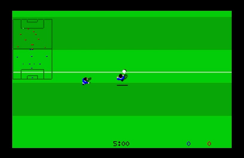 Everything in Kick Off is top down. You’ve got a full size pitch, scrolling in all directions, with everything properly proportioned. There’s a scanner showing player positions, and all the players have their own abilities, based on pace, accuracy, stamina and aggression. I’m not sure if this was a first, but the referees had their own style too, dishing out yellow and red cards, awarding penalties and adding injury time, with all the “accuracy” of a real-life referee! A single button and your joystick were all you needed to dribble, pass, shoot, chip, head and tackle. The goalie did his own thing until he had the ball, which was the cause of all kinds of blaming and shaming when you lost a game! There’s five difficulty levels, from International to Sunday League, and a great feature is being able to test yourself against higher level teams (where you being Sunday League versus International will eventually become the default). Otherwise, it’s a fast-paced, realistic game of football!