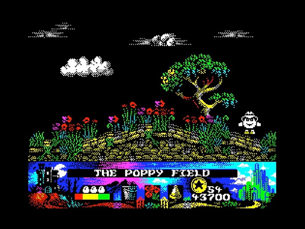 Wonderful Dizzy is based on The Wonderful Wizard of Oz, the children’s book by L Frank Baum that was interpreted as a reasonable movie if you’re under ten years old called The Wizard of Oz in 1939, then various other dreadful things since. And having said that, I look forward to the wrath of Johnny Depp’s Twitter defence league – I kid you not, go on there and post something derogatory about his even more dreadful Sweeney Todd and see what happens!!! Anyway, in Wonderful Dizzy, you’re the kind of Dorothy but in egg form, and as a fierce wind approaches, you and your pet Fluffle, Pogie, take cover in your house, but that gets torn out of the ground, chucked around in the wind then lands on the Wicked Witch of the East, one of four witches that rule the magical land of Oz where you’ve ended up. The West one isn’t happy and runs off with Pogie, so you need to rescue it and find a way home. The Wonderful Wizard of Oz can probably help with that, and you’re going to be platforming and puzzling your way around Oz and his Emerald City, coming across familiar scarecrows, lions and tin men on the way – all in egg-form, of course!