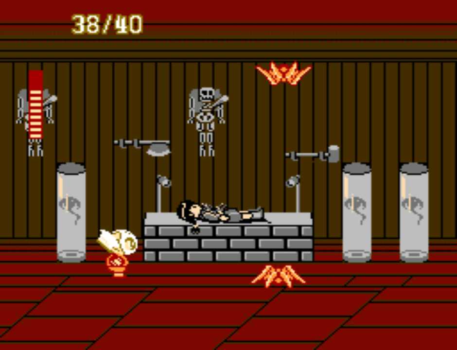 There’s no doubt that the deformed art style is one of the main pulls here. It might be cute, but it still manages to pull off the monstrous, albeit usually in a very unrealistic Nintendo way. But the various environs are as creepy (and sometimes just plain dark) as you like, and they often look stunning – sometimes as good as it gets on the NES, with some really rich, vibrant colour palettes that are as full of character as the characters! There’s a semi-hidden Egyptian level that has the best large-scale use of gold colours you’ll ever see on a NES too! You’ve got some really cool monster design throughout, paying homage to the arcade game, but also referencing horror film and pop-culture all over the place – The Fly boss was another favourite! And everything animates so smoothly, with some very nice multi-layered scrolling for the time. It’s a looker without any doubt! Sounds alright too – the spot effects aren’t groundbreaking, but the chip tunes are perfectly positioned, and as multi-layered as the scrolling!