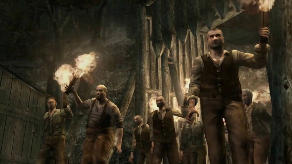 Recalling all these things I enjoyed one after the other is testament to the game’s pacing throughout the 25 or so hours it took me to complete it. From the very start, it’s relentlessly pushing you forwards, whether to progress the story or to progress your ability to progress the story. You’re rarely going to be wondering where to go next or trying to fathom obscure puzzles involving myriad items and all the related back and forth Resident Evils before this loved to throw at you so much. There’s a bit of backtracking and a bit of puzzle-solving, but I’m struggling to remember anything that bothered me whatsoever, and on the whole you’re on your way from one set of set-pieces in one area to another set in the next, interspersed by different levels of adrenaline rush. This might be from something as simple and frequent as taking down a regular enemy with some style, getting through an onslaught of firey catapults, completing one of the frantic on-rails sections, or finding yourself face to face with Dr Salvadore and his chainsaw in a minecart, but the biggest rush for me came from just turning around and looking back at one particular room…