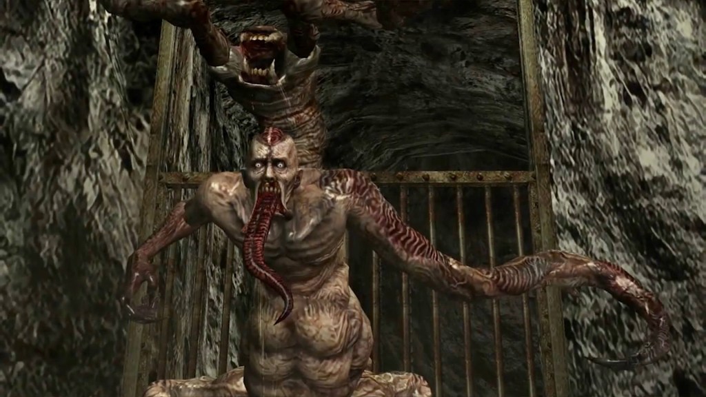 The parasite enemies versus zombie enemies of previous Resident Evils do change things up quite a lot, where they’re quicker and have some intelligence about them, though shooting them in the head still works fine – especially when it’s from miles away with a fully-upgraded scope on your rifle! It’s not just zombie cult farmers, tooled-up chanting monks, very well-armed (and sometimes shielded) soldiers, walking suits of armour, chainsaw bag-head guys and the like you’ll be shooting up though. There’s different, much tougher (and far more sinister) versions of them that wouldn’t look out of place in Silent Hill; there’s various parasites, flying bugs and those undead wolves; there’s lumbering giants that act as regular mini-bosses and Iron Maidens with extending spikes on the outside; and there’s the regenerator – no doubt one of the most feared monsters in gaming history, relentlessly moving towards you, with multiple parasites regenerating body parts, each requiring individual attention from your rifle (or just shutting a door on them)!