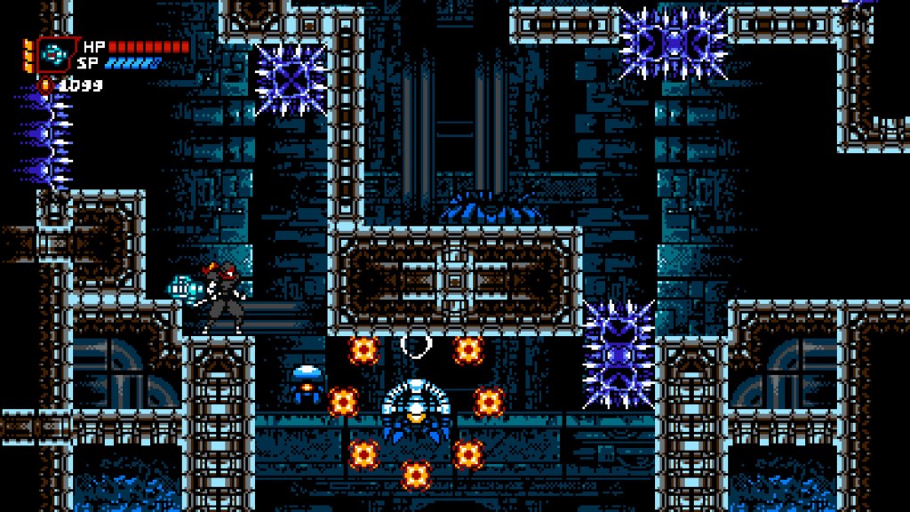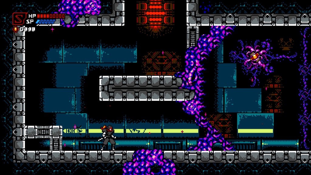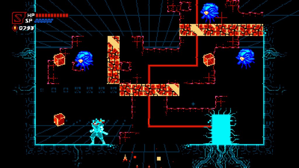You start off basic, with your techno-ninja running, jumping and slashing, but as you progress you’ll start to discover and evolve regular genre tropes such as dashes, wall-slides and double-jumps, as well as health and secondary weapon or power lifespan upgrades. The latter are also unlocked as you progress, with a basic shuriken for longer-range combat then being enhanced with additional properties, and also being supplemented by special abilities such as energy bolts or an upward slash that fires poweful flame attacks; these are obtained and selected at most of the checkpoints you come across, in exchange for cash you’ve found on the way, and generally offer something useful for the next section or boss. As a reminder of the game’s cruelty though, take three hits with one of these equipped and you’re losing it!