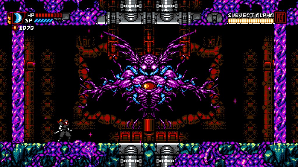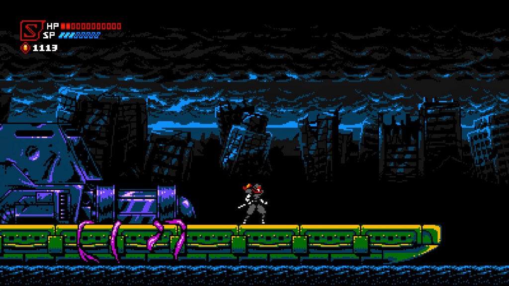 Brutal difficulty is certainly not the only place that Cyber Shadow looks to the NES for inspiration. Graphically, this is the NES game of your dreams! It’s authentic, but it’s like any technical limitations have been removed, so it’s full of NES colour, full of detail and full of stuff that can kill you! I really loved the way it used big black spaces with muted highlights and shadows to invoke a very oppressive atmosphere at points too, and when you notice all that parallax scrolling, or the 8-bit rain coming down on top of it all, it just looks gorgeous! Pretty much the same can be said for Enrique Martin’s cyber-synth soundtrack too, which was noticeably sometimes the only saving grace at some of the game’s more bleak difficulty spikes!