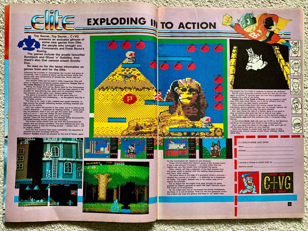The following month C&VG has an exclusive on all sorts of stuff from Elite, dominated by the iconic first level of Bombjack on C64, but opening with something intriguing… “Despite what you’ve read in other magazines, Elite still plans to release its cartoon computer adventure, Scooby Doo in the Castle Mystery, for the 48K Spectrum. On the next page we’ve also got the Scooby screenshot from the advert, where we’re told the game is now coming in April, but Elite boss Steve Wilcox also tells us “it will be different from the version which has been heavily advertised.” Seems they’d run out of memory in the 48K Spectrum after all, so the plot thickens – all in the space of the same preview!
