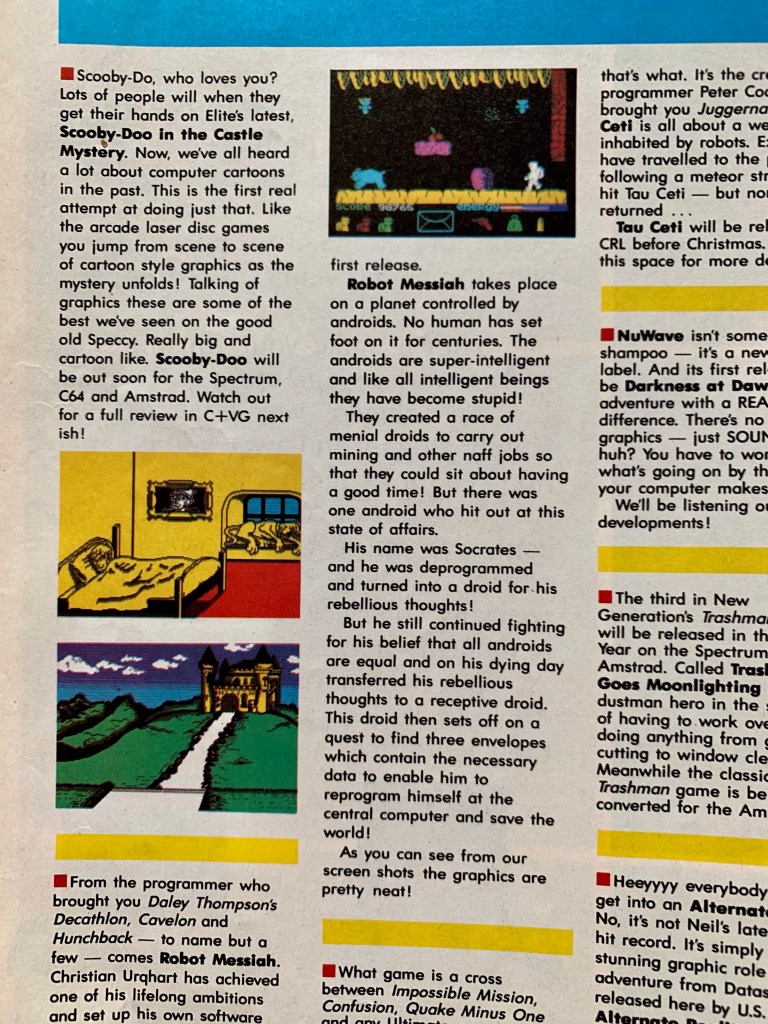 In one example of actual gameplay, Scooby is walking down a corridor in what sounds like an animation, then as he approaches a trapdoor the viewpoint changes and it’s up to you to direct the action, interfering with the outcome of the cartoon rather than just playing a game; we’re clearly talking about something like Dragon’s Lair I guess, but the intention was the action and the outcome would be different each time you played. They wrap up saying that when they visited Elite, the raw material was all there and it was being edited together, with all the animations committed to memory and just a few final details to work out…