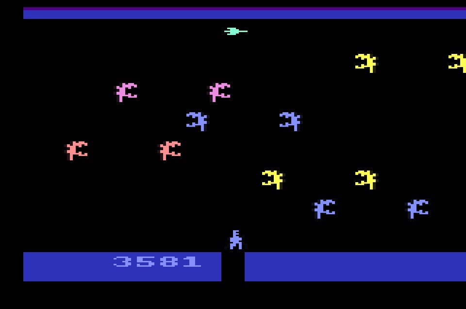 As was often the case with the Atari 2600, the developers had to make the most of all those levers and switches on the console, so Alien also gives you four difficulty switch settings, where the aliens travel randomly or in fixed patterns, and where a pulsar has an effect or has no effect on the aliens (which actually equates to three settings because one of those makes no difference)! You’ve also got four skill settings, from practice to expert, though for all of these options (same as for pretty much all 2600 games), I’ve not had any more fun in any of these endless variations than by not touching anything!