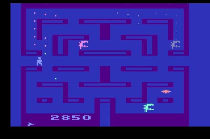The manual goes further, telling us that we have to run through the hallways of the space ship, crushing all of the Alien eggs which have been placed there while also avoiding or destroying the adult aliens, and snatching up as many prizes as possible. And what do prizes make? Points of course, which the manual helpfully has space for you to write down at the back! You just move the controller up, down, left and right to run over the eggs and steer clear of the aliens, where the slightest touch from the albeit slightly forgiving collision detection means instant death. On either side of the screen you have a “Hyperwarp Passage” that is better than Pac-Man’s version because it’s called a Hyperwarp Passage, but similarly takes you to the other side of the screen. However, in an even larger departure from Pac-Man, you’ve also got a flame thrower which you can use up to four times to scare off or immobilise or potentially have no affect at all on the aliens, unless you’re on the extreme right or left of the screen where fire doesn’t work – I’m sure there’s a great reason!