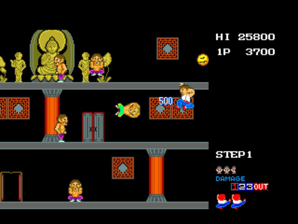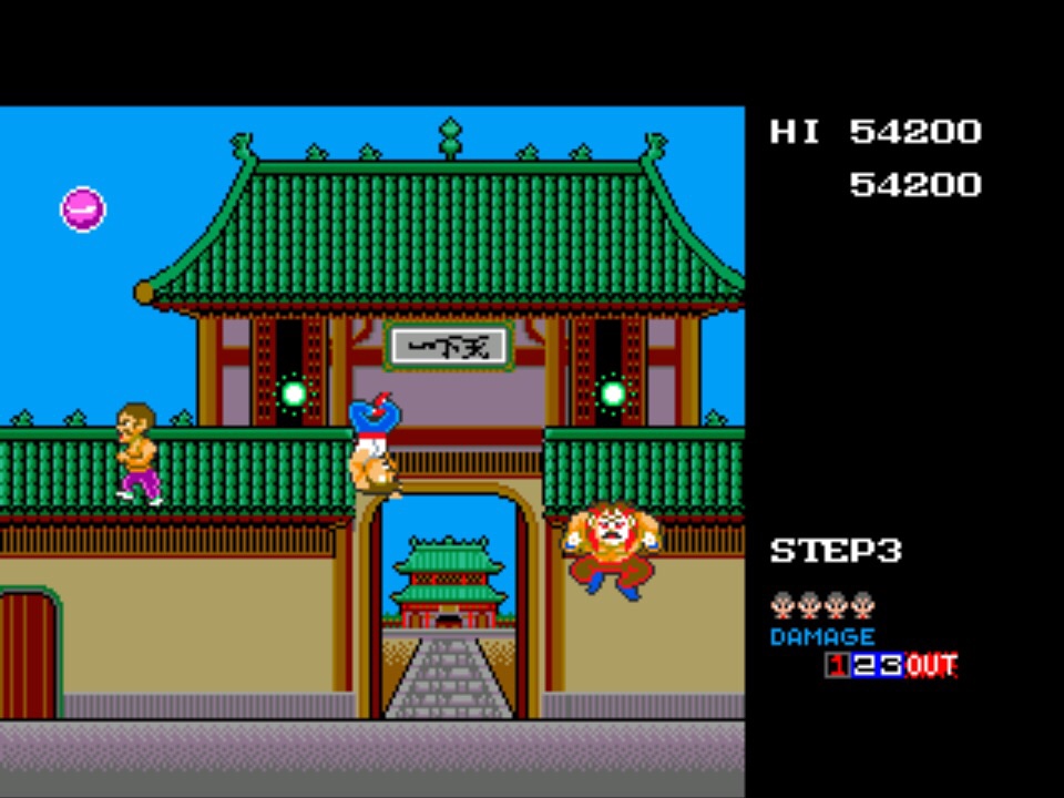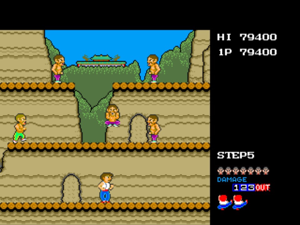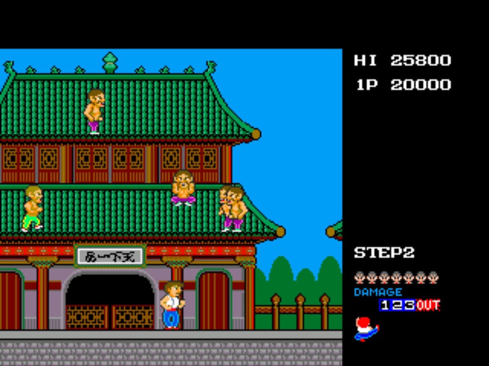 Apart from one or two expert moves with power-ups that are completely superfluous to beating all the levels, the gameplay is simplicity itself, with you jumping up and down levels and kicking your way through loads of enemies. Jump. Attack. Nothing fancy! There is a bit of strategy needed in the boss characters, and in timing your up and down movements to avoid taking unecessary damage if you want to go far, but you’re going to be on the second level and feeling like Bruce Thai in one or two goes! Most of this happens on a single screen, but at each end you’ll get a very short side-scroll that extends the play area a bit, and within each stage’s three platform levels you’ll also get some gaps in the floor or roofs to jump between to add a bit more danger, with a fantastic slapstick animation if you get too close to an edge! Clearing a level of enemies gives a slightly more rewarding animation though, with a strongman pose and the word “GUTS” captioned about your little guy Lee, who’s got three lives, and three hits are allowed per life per level.