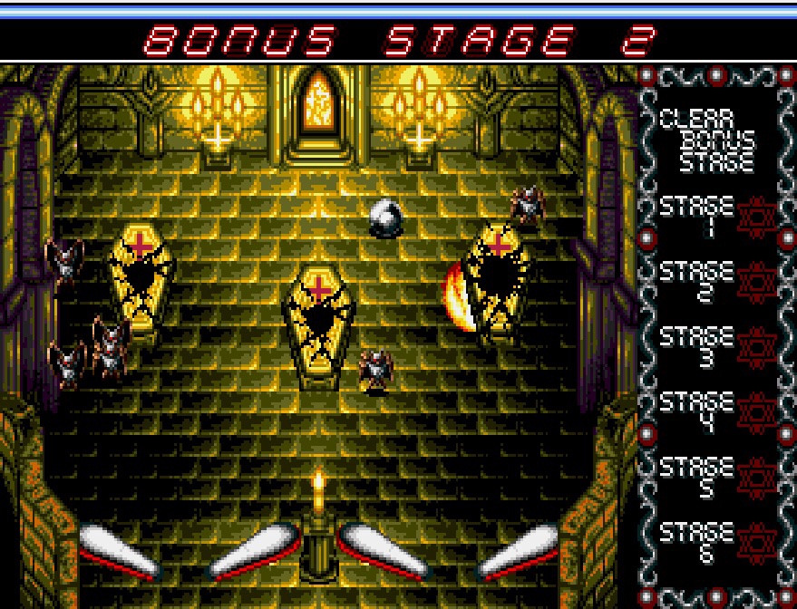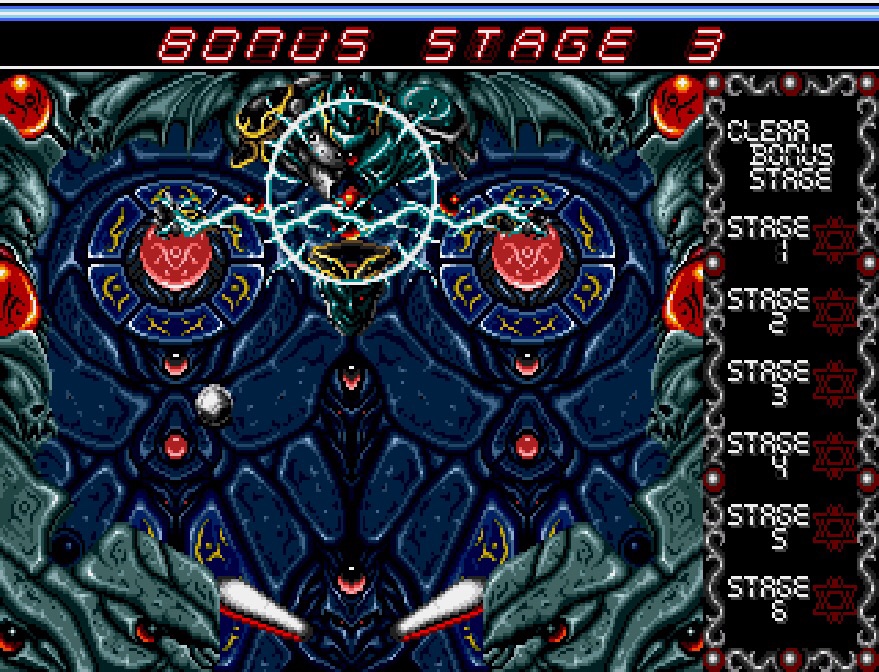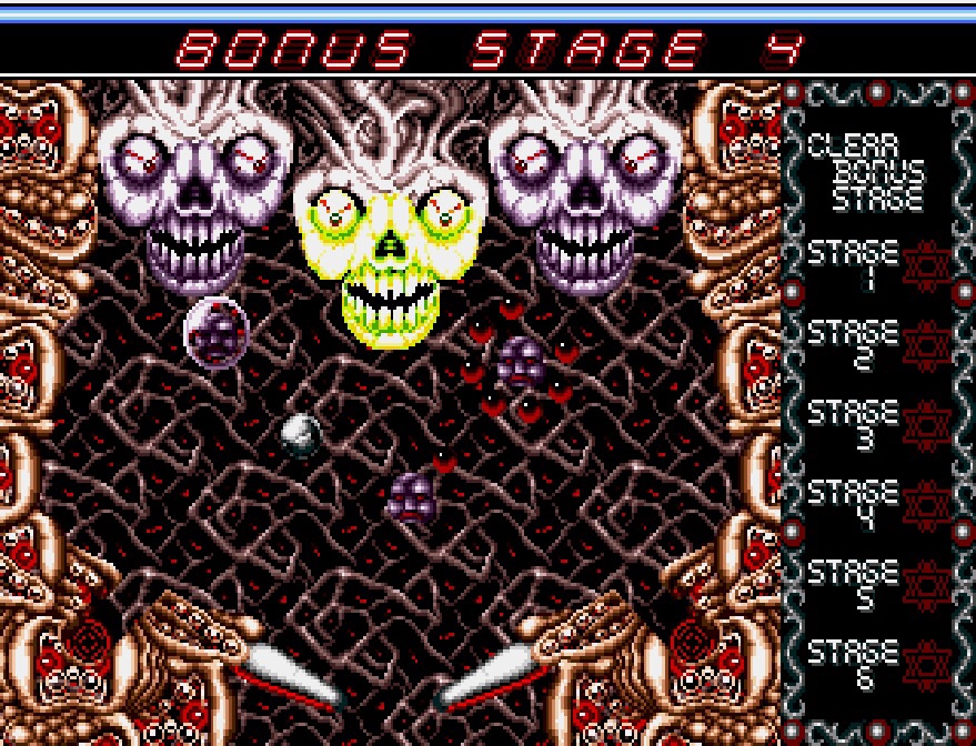 Devil Crash MD, to give it its full name, is the uncensored Japanese Mega Drive port of Devil’s Crush. However, it wasn’t just coffins that were deemed too much for western audiences, but the name itself, and America and Europe got the more fantasy-themed Dragon’s Fury, which was to all intents and purposes the western release of the PC-Engine game. There’s really not much between these two games whatever they’re called though, and on any given day I might veer between the larger playing area and more realistic physics of the PC-Engine version or the vibrancy and slightly more realistic flow to the game of the Mega Drive version. Overall the latter might just pip it at the post though, with its bit more gothic title music, set on top of a more flamboyant title screen featuring the snake lady. “More flamboyant” is a good way to desribe the main game theme on this version too, as well as some of the graphical flourishes like the steam going on around the base of the plunger, more flames and bigger explosions; it’s just generally all a bit more bold and in your face. It’s also got its own user interface down the right side of the screen, which does result in a comparatively smaller table size, but on the other hand is giving the serious player valuable progress information. By the way, what I’ve discovered in the pursuit of reasonable points is a reliable but boring strategy – get up the top, block the hole, get good at a couple of mini games and the sky is the limit! It got me to 36 million points, but really, don’t play if that way!