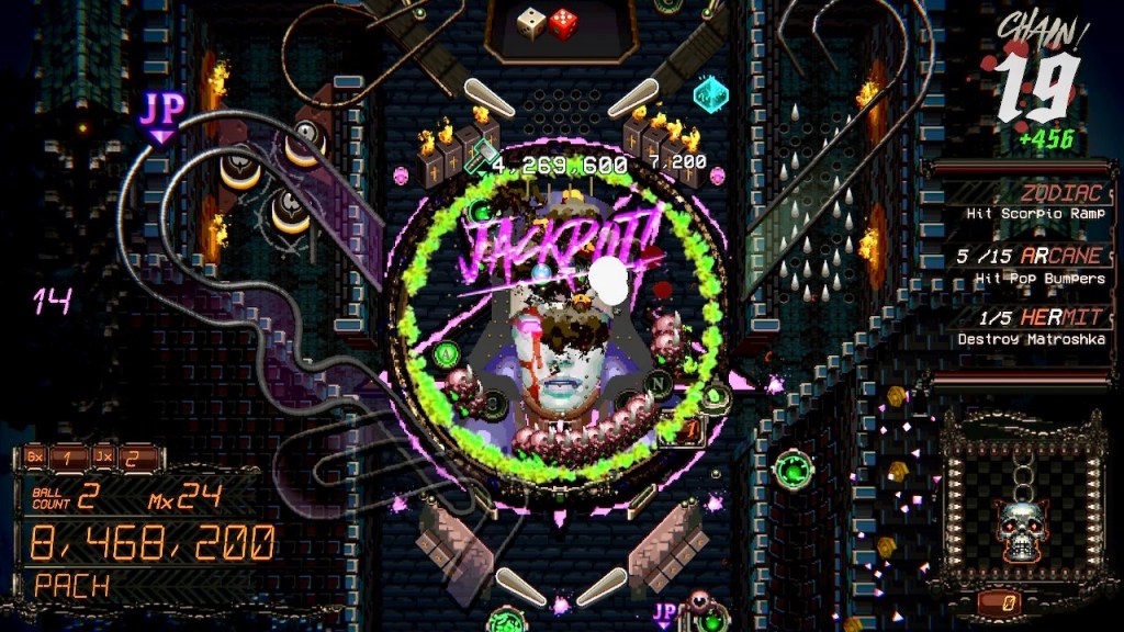 There’s movement everywhere, with so much just waiting to respond or explode or squelch or fight back at the slightest touch from your balls, and completing the right challenges will open up one of eight special single-screen bonus tables. Get a perfect on all of these and you’re in for a big 4x score multiplier, but there’s also mega points available for all kinds of perfect shots, like dropping a ball into the snake woman’s crown without touching any slime. Actually, landing your balls in her crown regardless is going to give you the game’s trademark visual pay-off, with each one (followed by hitting the right bonus symbol) gradually changing her from some kind of vampiric sleeping beauty to alien snake monster as you play, then once she’s there you shoot her again and you’ve got another bonus table! Tilt is going to play a big part in scoring big too, with a single tilt “direction” making it a little hit or miss, but it is going to be far more forgiving than in many other pinball games, encouraging its use as part of your arsenal. Another mechanic of the Crush games is the last chance, where once you’ve lost your three balls you’ve got a spinning something-hundred number to stop; if that matches the last three numbers of your score, you get one more chance with an extra ball, so stop at 900 and your score is 427900, for example, and there you go!