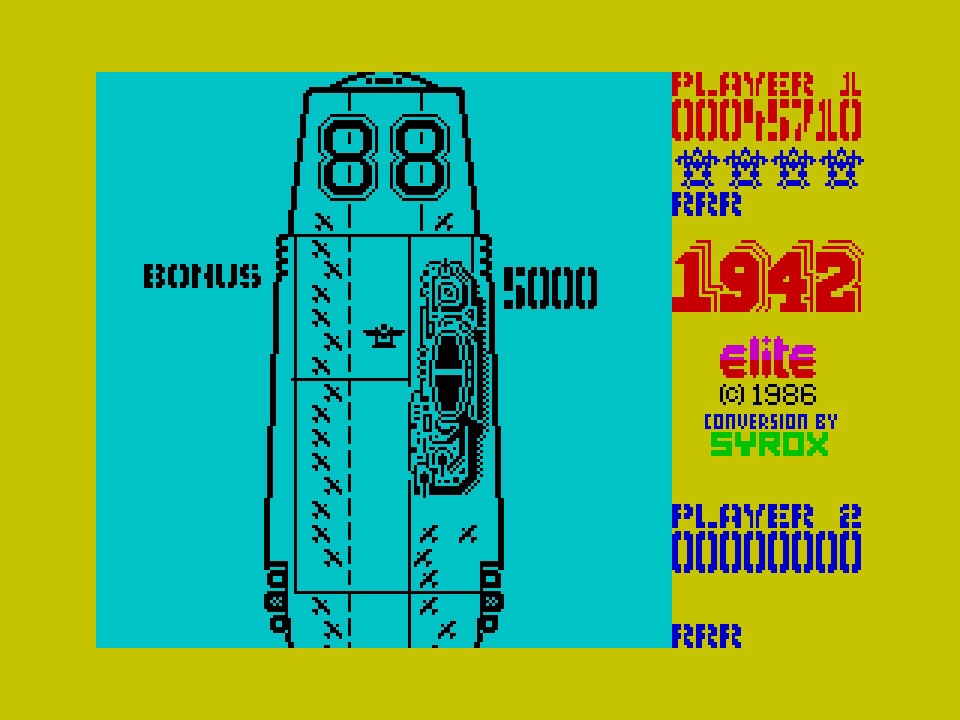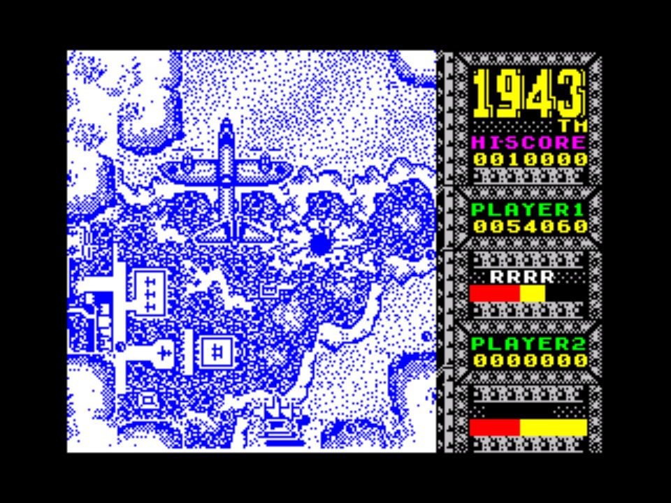It does all pick up once you start flying over islands though, as does the inevitable result of some of those colour choices, with some especially fine examples of colour clash when you make landfall! Sound is equally – and mercifully – bare bones too; can you imagine all that whistling coming out of the Spectrum??? They cracked the gameplay though! It’s a little less frantic than the arcade version, though no less challenging, and some very minor suspicions about collision detection now and then aside, it’s always held its own as both a Spectrum shooter and a great conversion. And most importantly for something as addictive as 1942, it was now in your bedroom, so no more bugging your mum for another 10p, and not a disembarkment in sight!