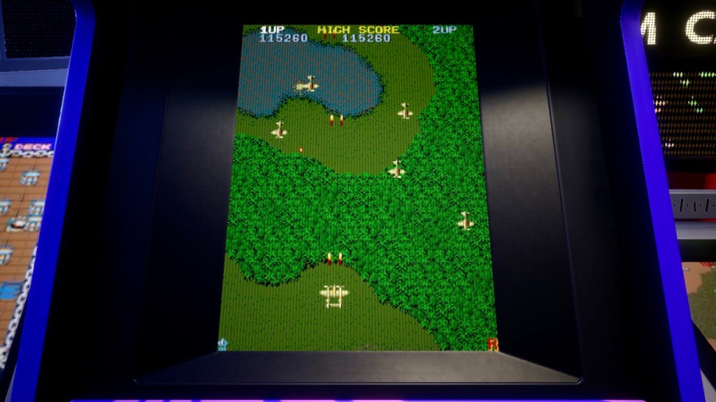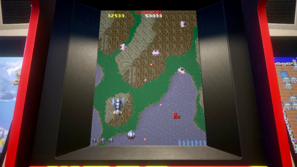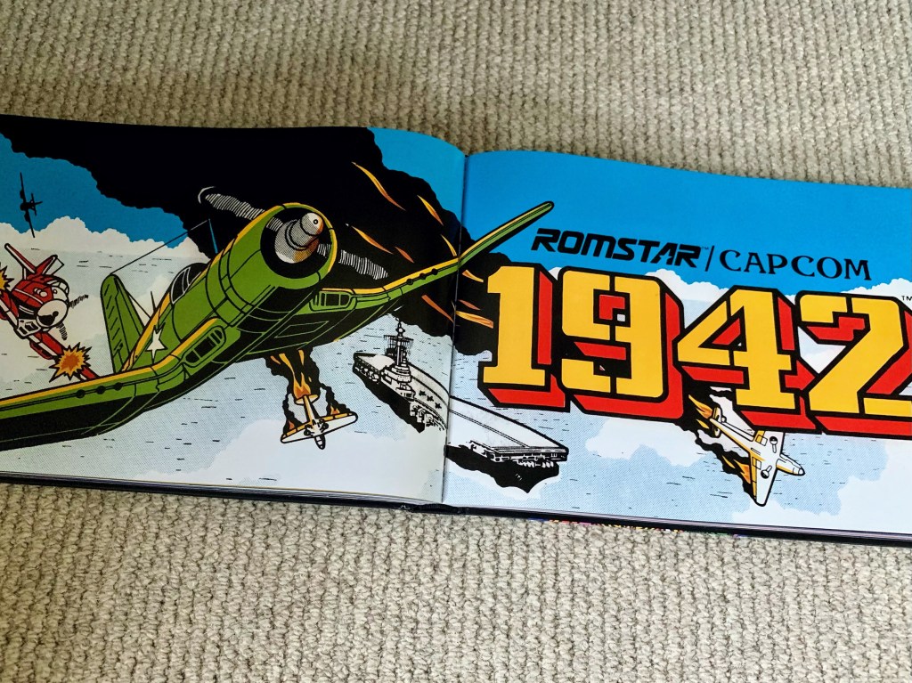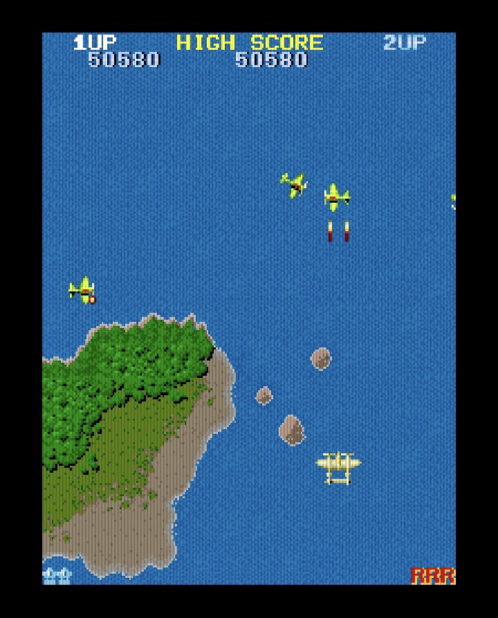 And of course, the highlight of whatever the rest of the arcade machines were on this particular ferry crossing was an all-new vertically scrolling war plane shoot ’em-up marvel called 1942! It originally appeared the previous year, at the hands of Capcom’s Yoshiki Okamoto, who, as well as designing its follow-up, would later go on to design Final Fight and a much under-appreciated series called Street Fighter! But back in 1984, he was very successfully following in the footsteps of another Capcom vertical shooter (and actually, I think it was their very first arcade game), Vulgus, where you alternated between being on a planet surface and in outer space taking out giant insect mutants from the planet Vulgus! Despite that, it’s not terribly memorable, though I do have a soft spot for it as a clear predecessor to 1942, and it’s also where that famous Capcom “Pow” power-up icon first began!