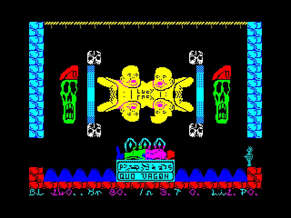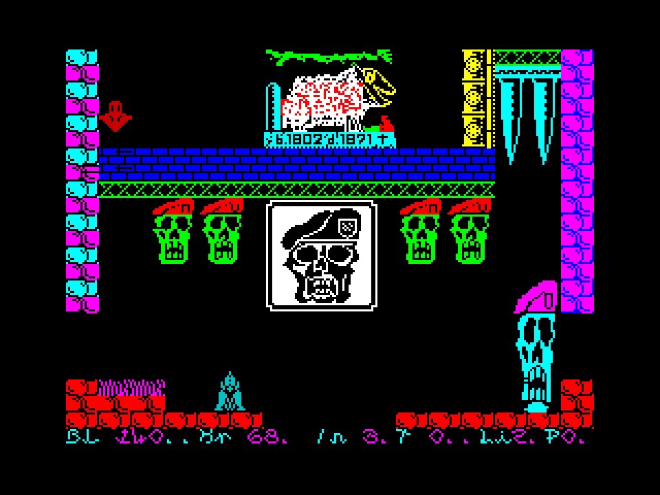 Then there’s a framed picture of a skull in an army cap surrounded by green skulls in army caps, then a big one appears and chases you around as another set of spikes ominously hang from the ceiling next to a sheep with a fish’s head moving around on a trolley. There’s four co-joined babies being stretched on a rack over a dead body being drained of blood by some spikey hammer things. There’s gibbets and other medieval torture devices amongst the Spectrum-magenta brickwork; there’s piles of bodies and another baby, but this time its head is in a cobra’s mouth! And all of these things are huge and brightly coloured and moving around with gay abandon between all the platforms and moving catwalks and traps you need to negotiate.