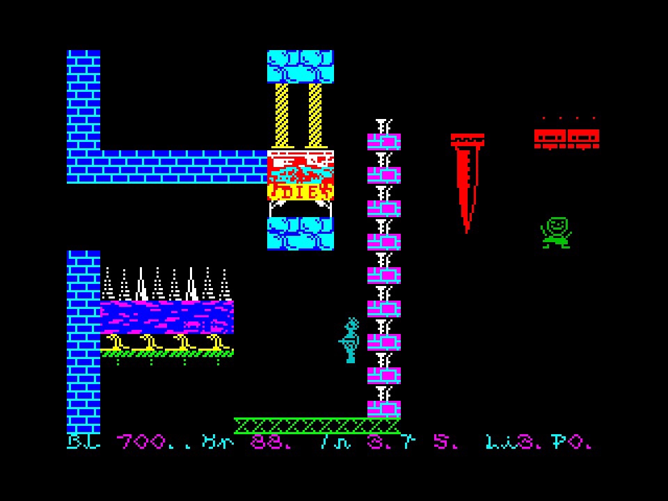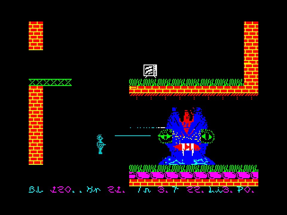 First off, you’re going to be looking for the fridge, which is randomly placed in this 256-screen nightmare at the start of every game. Each screen is a room full of platforms and passages, spikes, falling objects and mundane things that might do you no harm on one screen then kill you in an instant on the next! There’s also various ghosts, aliens, pumpkin monsters, TV’s and unidentifiable machines of ill-repute flying about the place either shooting at you or just waiting for a touch to drain your life away. You can take these enemies out with your laser gun, but use it too much too soon and it overheats and jams. You can also become invisible three times per life, making you invincible as well, but then the only way you’ll know where you are is by shooting your gun to reveal yourself. Your gun can even be used to take out the scenery – spend ages shooting at a brick or a tree, for example, and eventually you’ll whittle away what’s probably going to be a very pointless shortcut!