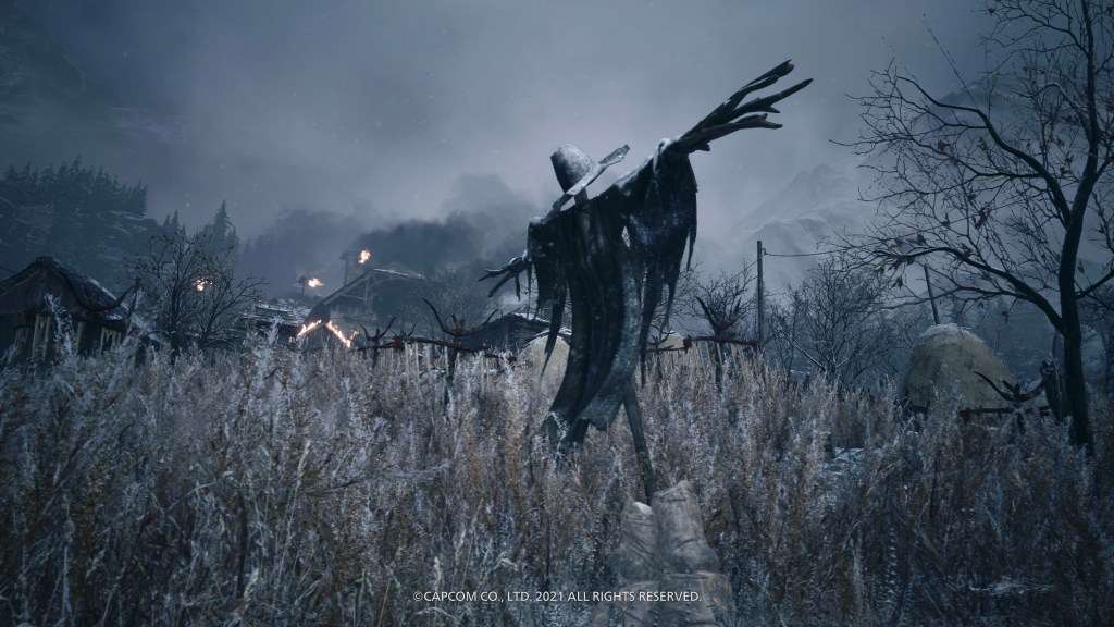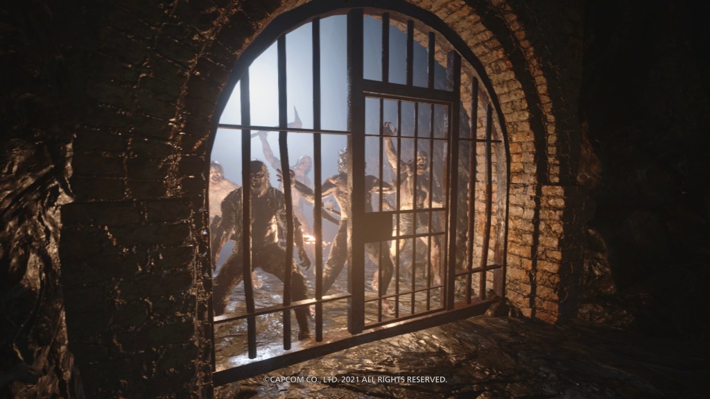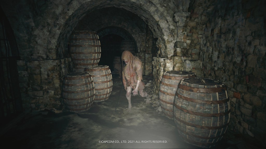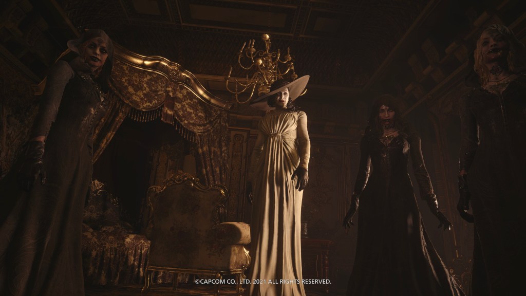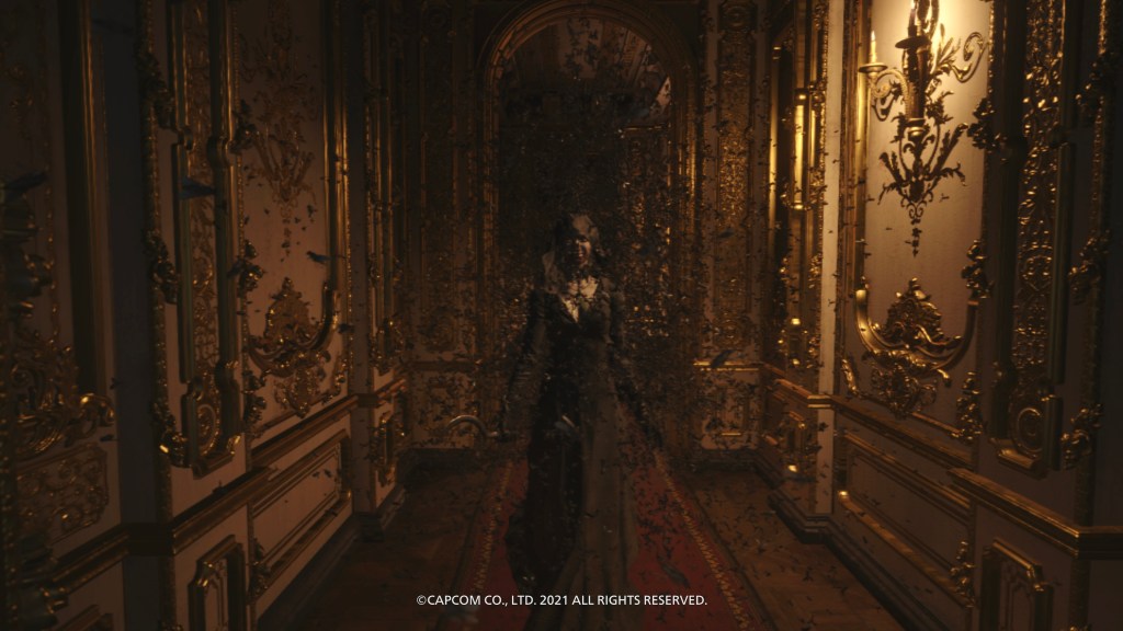 Quick note on the story. This is a direct follow-up to Resident Evil 7, continuing the story of Ethan Winters after he rescued his wife from supernatural Texas Chainsaw country, but now they’re in exile somewhere in Eastern Europe and he’s got a baby daugher to rescue this time. After being kidnapped by Resident Evil stalwart Chris Redfield and his cronies, she’s kidnapped again by our aforementioned four supernatural crime-lords, who are all at the behest of wicked witch Mother Miranda. As well as being the best looking game I’ve ever played, this is undoubtedly my game of the year so far, trumping even Ghosts ‘n Goblins Ressurection, Outriders and Cyber Shadow, all of which I thought were utterly wonderful, then there’s Genesis Noir, Narita Boy, Pac-Man 99… And we’re still in May! Anyway, I choose to say this now because the first time I was introduced to this baddies collective in a very early cutscene, all of that pre-launch excitement about having a new and improved Resident Evil 4 on my hands got a teeny bit tempered. Lady Dimitrescu was fine, and her three insect-infused daughters even more fine to this particular old goth! Modern-day Frankestein Karl Hesienberg was alright too, even if he was no Ramon Salazar. But then there was this doll running about shouting like some crazed Harley Quinn nerd figure, who turned out to be representing Donna Beneviento, a creepy dollmaker. Now, I’m not saying that either of the first two are any kind of realistic, but they were at least grounded in the same kind of horror reality that we were treated to in most of the previous game with the Baker family, but all these in-your-face Bride of Chucky histrionics just seemed a bit out of place at this point. As did the fourth Lord, an oozing, deformed aquatic worm-man thing by the name of Savatore Moreau – I might have loved the lake monster boss from Resident Evil 4, and this might have been a strong hint towards something similar to come later, but all the same, it’s not really what I wanted as I transitioned from a lycan-infested scene of rural slaughter into the golden vampiric opulence of Castle Dimitrescu; a couple of Scooby Doo villains making an overly dramatic entrance was all a bit jarring!