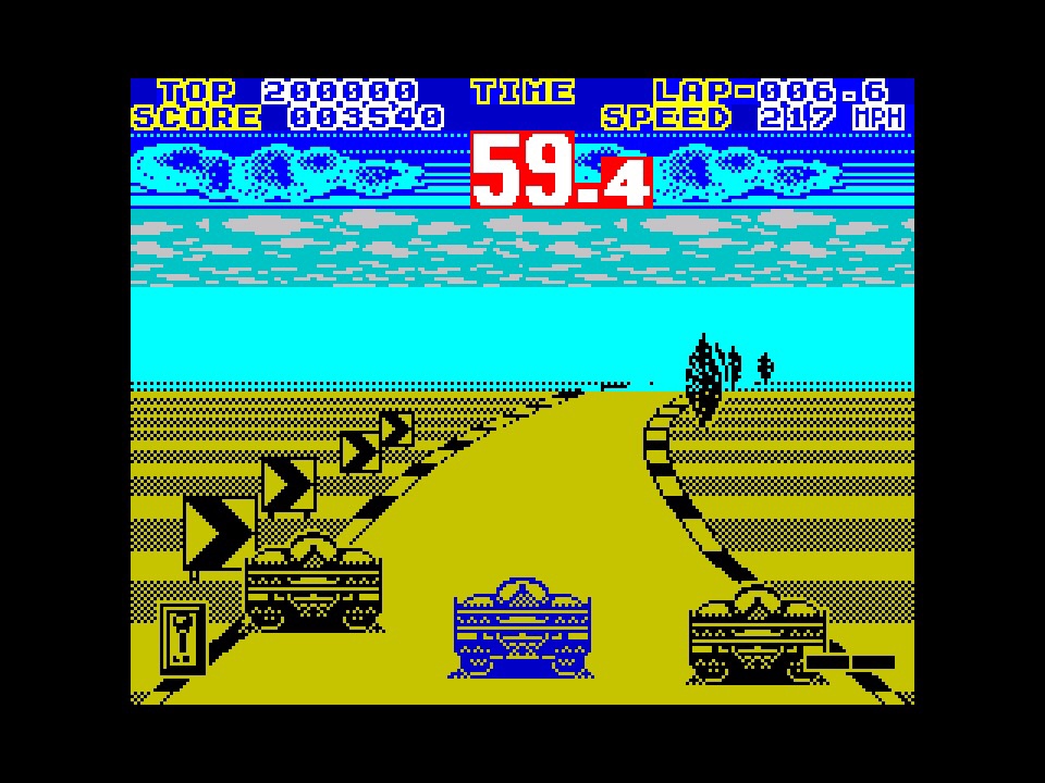 The graphics aren’t quite up there with Enduro Racer, but it’s as good as Spectrum racing gets apart from that (including Chase HQ, in this humble opinion). The track curves and undulates beautifully, and with the signs, adverts and trees along its sides, it’s all moving at a very smooth and a very fast pace. The backgrounds aren’t anything you’ve not seen before, and the car sprites are a little boxy, but they’re big and detailed, though I’m still not convinced about the choice of blue for your car, which is most apparent when you go off-piste and the colours start fighting with each other. But given the sense of speed, and the sheer amount of stuff being thrown around at that speed, I’ll forgive it a bit of clash, especially when the car’s in full spin. Sound is non-existent on the 48K version and barely functional on 128K, though it does have a nice bouncy title tune.