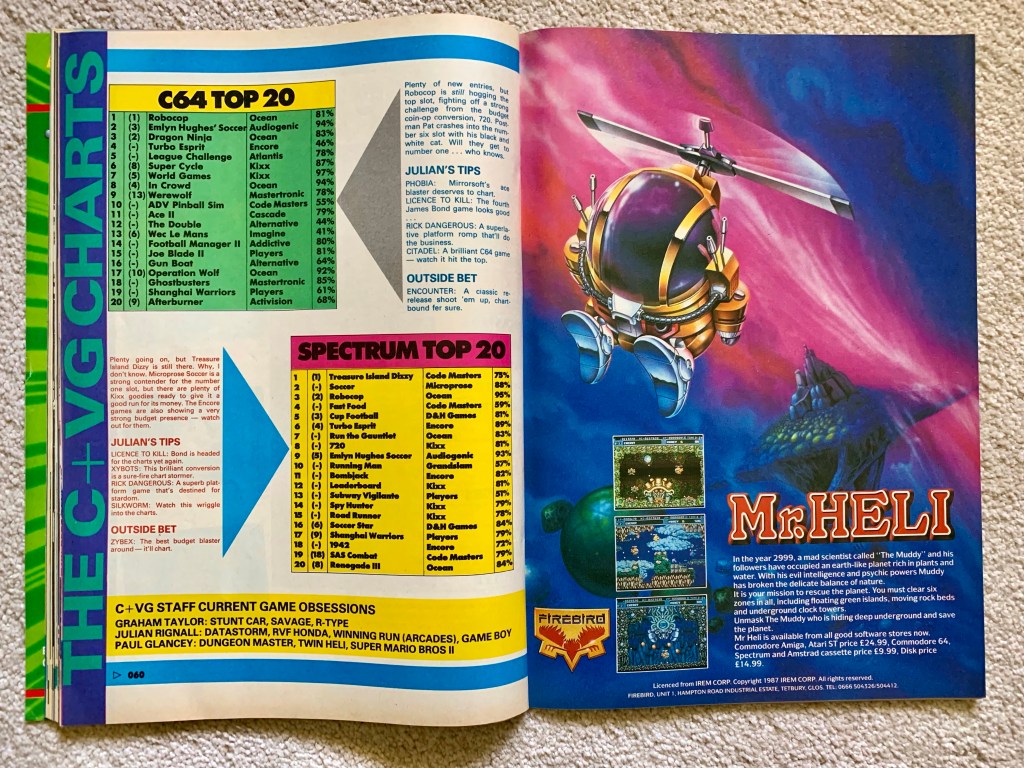 I recently came upon a wonderful game called Mr Heli, or Battle Chopper in the US, or Mr. HELI no Daiboken on PC-Engine where I played it first, to be precise, or, minutes later, plain old Mr Heli again on ZX Spectrum! It’s a bit like Fantasy Zone meets multi-directional cavern shooter, and was originally a 1987 arcade game from Irem. When the ports arrived in 1989, I definitely remember the name, but that’s as far as it went – no interest in playing something like I could see in the tiny screenshots on the advert that did the rounds in the gaming magazines, when there were the wonders of Defender of the Crown, Xenon, Stunt Car Racer and Dungeon Master to experience on my fancy new Atari ST. And Mr Heli to a 17-year old… Now Battle Chopper might have been a different story!