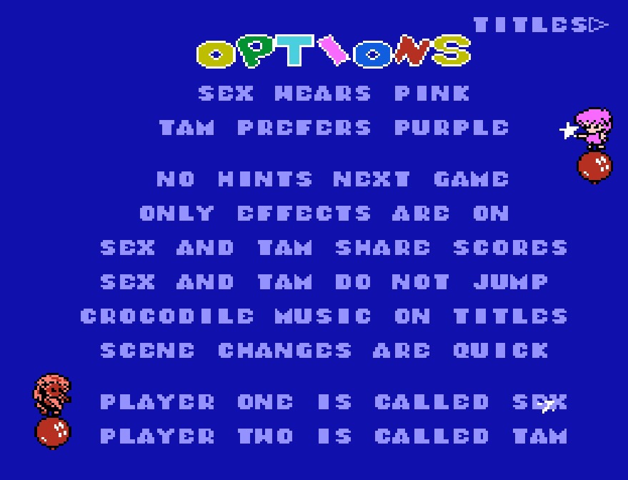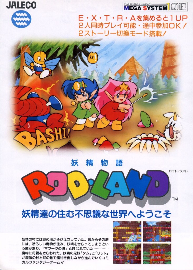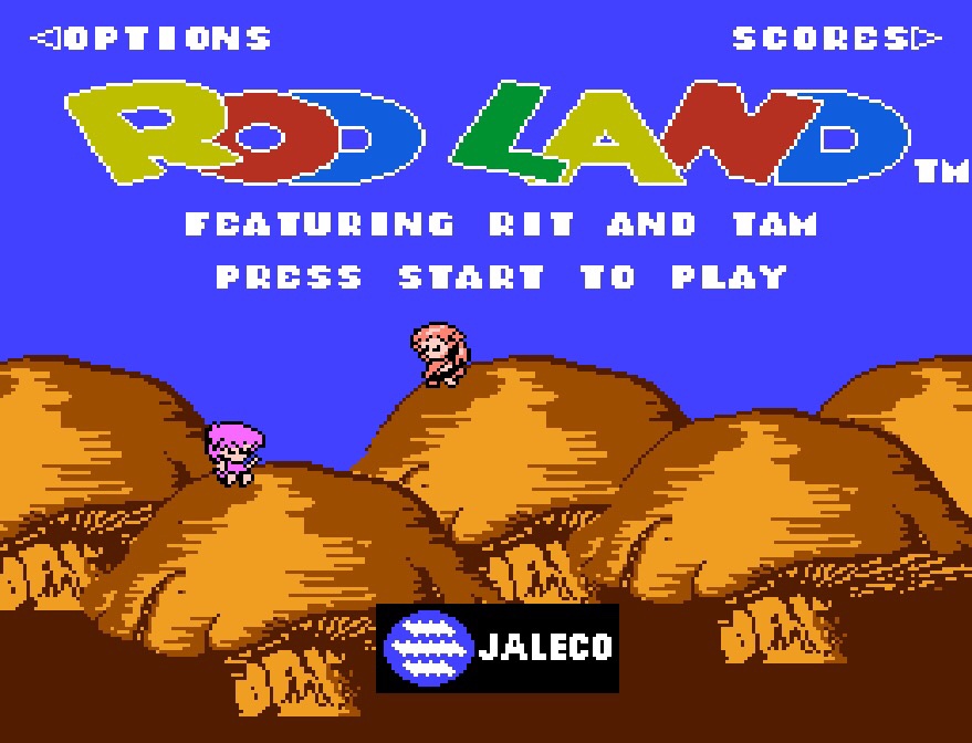 The Rod Land arcade game had a very special and unique feature – the sequel came with it! Just finish the game and there it is, a whole new story about an alien pyramid making off with your father, new characters and new level designs, although I don’t think there’s much different happening gameplay-wise. You could also get to it with a secret code, then go back again with another – pay your money, press up or down three times, off you go! This all led to three different endings too, one for the original game, one for the sequel and one for switching to one or the other with the code and beating an extra level that throws up. Sadly this wasn’t included in the NES version, but there were some nice hidden touches here too! On the options screen, you get to name your two fairies, but enter something rude like BUM, TIT, POO, NOB, SEX, etc. and you’ll make them blush! And ICH and EAT will let you jump between levels in the game. One of the options allows your fairies to jump, which also isn’t in the original, meaning stomping on enemies adds a new dimension of adorable violence!