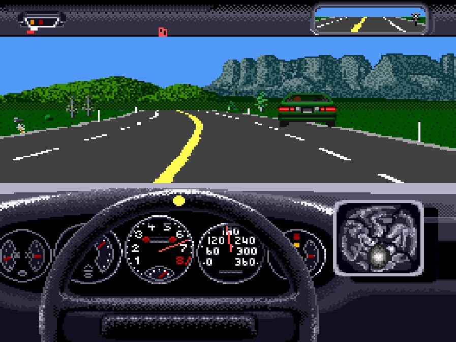 As we’ve already alluded to, being more Volvo than Ferrari, the SNES in general isn’t great at first-person 3D, but somehow what we have here is a real sense of speed as scenery flies by really smoothly, and with no Super Nintendo slowdown anywhere that I’m aware of, even when things get busy. Whilst other traffic, roadside objects and the various backgrounds are also more Volvo than Ferrari, they work fine, and are elevated by some really nice attention to detail, with the lights having form at night, or giving the rearview mirror a real sense of purpose as you try to keep some cars between you and your opponent, but also little touches like them using indicators as they peek out to overtake, or bugs hitting the windscreen, which I don’t think that even the likes of Dirt 5’s jaw-dropping next-gen graphical enhancements attempted! That said, Dirt 5 couldn’t match Atari ST’s Toyota Celica GT Rally for wiper effects either, but I’m sure we’ll come back to that one day… Top ten favourite racing game windscreen wipers? Anyway, each of the cars also has its own cockpit design with loads going on, and I love that my default behind the wheel view isn’t just the game’s default but also the only view you get! I know it’s asking a lot of the SNES to do any more than this, but the only thing I would have appreciated is a little more draw distance, especially for overtaking on a narrow stretch of road, or coming to a halt close to the gas station, but it’s not a big sacrifice for everything else! Not a huge amount to say about sound design – it’s also functional, with some nice engine effects, police car sirens and so on, but it’s a shame that the pan-pipe rock theme tune isn’t available during gameplay, which is something the Mega Drive version does offer! The volume of police car sirens coming and going depending on distance, and the very sultry “Test Drive Two” you get on the title screen now and again does make up for it though!