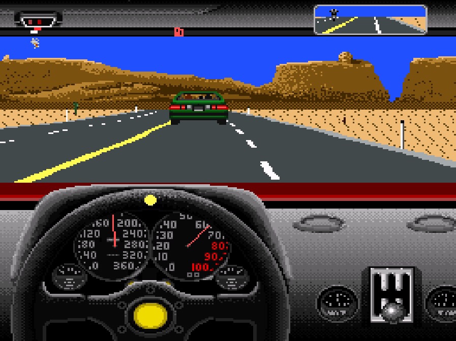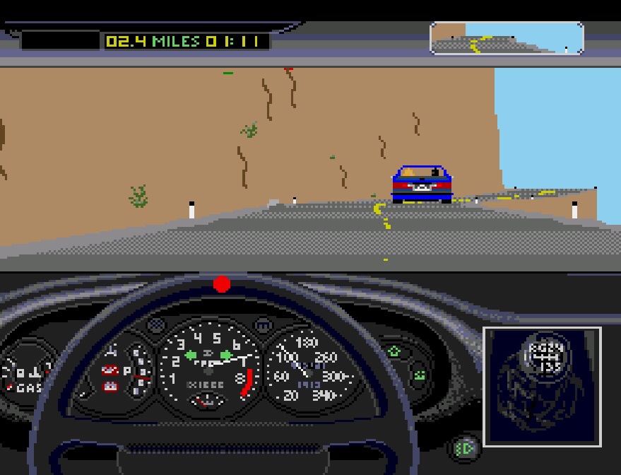 When the console versions did eventually arrive, they’d mixed up those American landscapes a bit, taking the computer versions’ multi-stage course (and penchant for cliffs with worms running up them!) and turning them into four courses which offer different difficulty levels and race lengths, ranging from five to eight stages. Desert Blast is the easy course, traversing a southwestern-style desert with mostly straight roads, not many off-road objects and it’s all in daylight. City Bound (medium) has you tearing around a more winding road somewhere with Mount Rushmore in the background, with more to crash into and a night stage. East Coast is hard and takes in New England and its coastline if you get that far; half of this course is in the dark or in the rain, there’s more objects to hit and the roads are more complex to navigate. Hardest of all is West Coast, referencing some Seattle landmarks in the opening stages and chucking the full works at you – wind, rain, snow, night, crazy curves, loads of traffic and loads to collide with. As well as separate track difficulties, you’ve got four driving difficulties too, with the default Rookie (auto-shift) letting you focus on getting a feel for the road, then Auto-Shift with a tougher opponent. Manual-Shift gives you manual gears, but also introduces the tachometer, and if you’re working the engine too hard for too long you’re going to start seeing smoke in the rearview mirror as all your power gets blown out of the exhaust pipe! Finally, Pro (manual-shift) is going to chuck in far more aggressive cops and far tougher opponents.