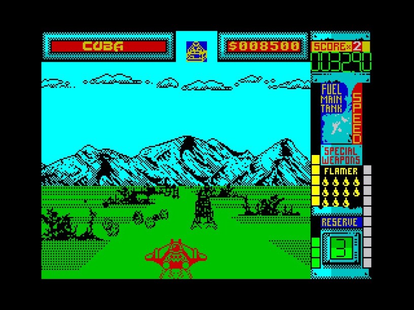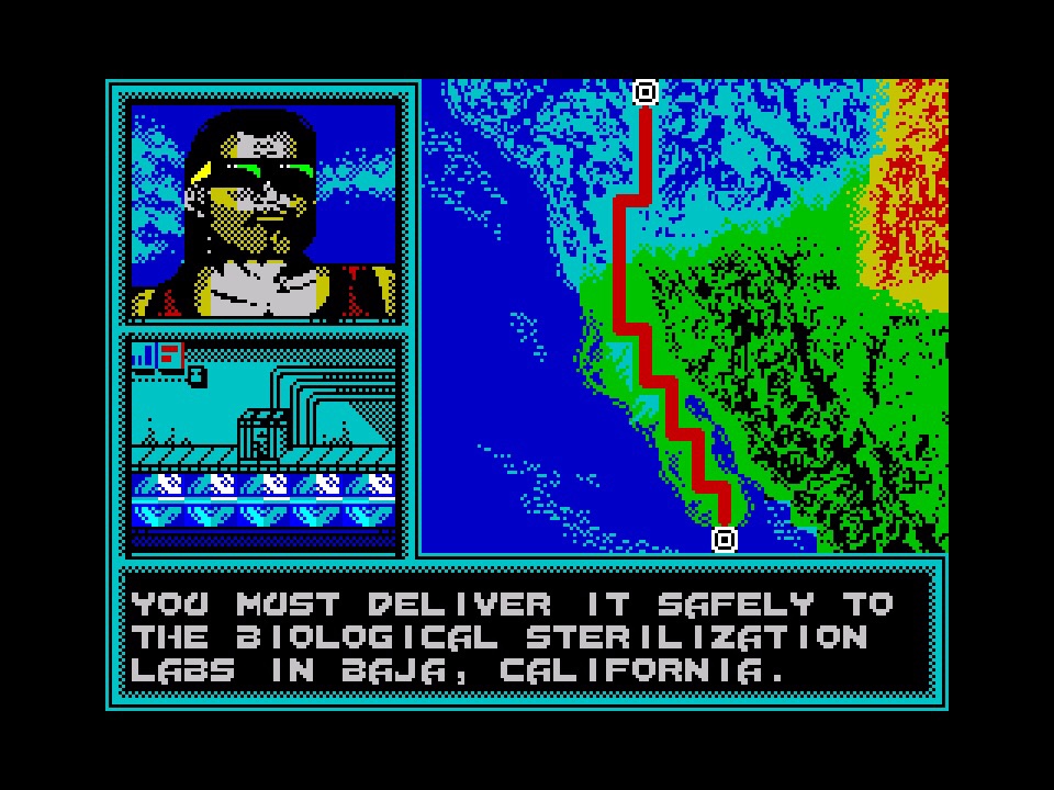 If you don’t look too closely, the Spectrum’s loading screen is a pretty good approximation of the arcade game’s title screen, with your wet-look tough guy and his black sunglasses in his hover thing, burning up a tropical river and burning up an unseen enemy with a preview of my favourite weapon upgrade, the flamethrower, shooting out of the front. I really like the trees in the background here – they just demand a Predator lurking about in them somewhere! Things stay very colourful as you get to the first mission briefing too, informing you you’re off to Baja, Calfornia with a fairly pointless map, what might be you or someone else in sunglasses, and your package getting ready for despatch. There’s a simple but quite jaunty piece of almost new romantic electronica playing in the background too, which is going to accompany you through the game – not at the expense of a few sound effects at least either, even if they are all a little on the lightweight side and I’d have really liked the feedback of some engine noise.